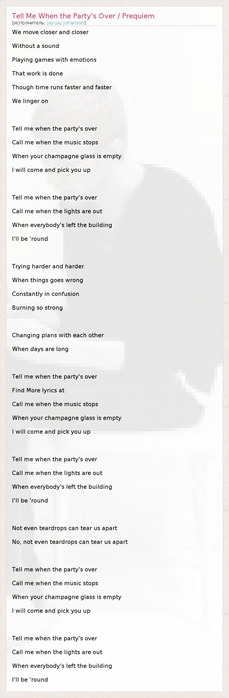 ГлавнаяИсполнителиJay-Jay JohansonTell Me When the Party's Over / Prequiem