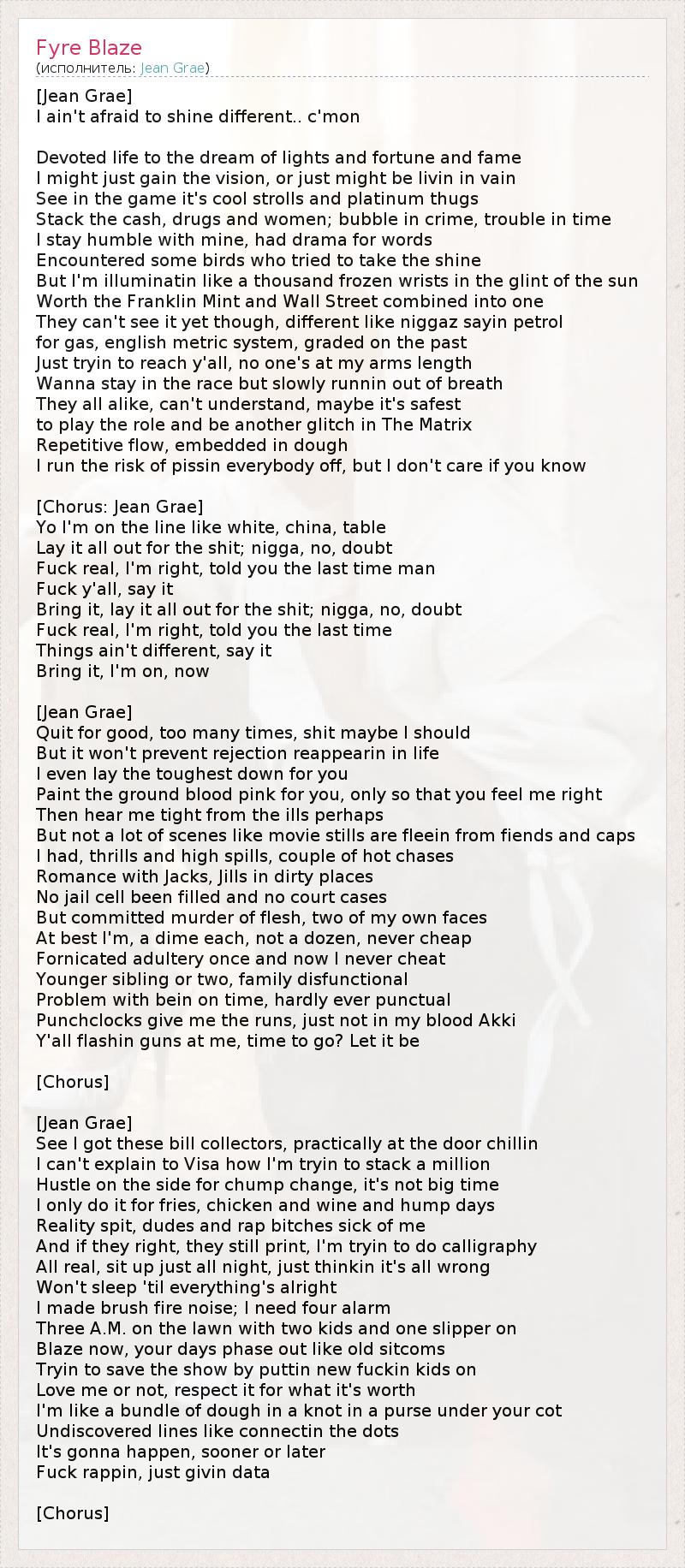 [Jean Grae] I ain't afraid to shine different.. c'mon Devoted life to the dream of lights and fortune and fame I might just gain the vision, or just might be livin in vain See in the game it's cool strolls and platinum thugs Stack the cash, drugs and women; bubble in crime, trouble in time I stay humble with mine, had drama for words Encountered some birds who tried to take the shine But I'm illuminatin like a thousand frozen wrists in the glint of the sun Worth the Franklin Mint and Wall Street combined into one They can't see it yet though, different like niggaz sayin petrol for gas, english metric system, graded on the past Just tryin to reach y'all, no one's at my arms length Wanna stay in the race but slowly runnin out of breath They all alike, can't understand, maybe it's safest to play the role and be another glitch in The Matrix Repetitive flow, embedded in dough I run the risk of pissin everybody off, but I don't care if you know [Chorus: Jean Grae] Yo I'm on the line like white, china, table Lay it all out for the shit; nigga, no, doubt Fuck real, I'm right, told you the last time man Fuck y'all, say it Bring it, lay it all out for the shit; nigga, no, doubt Fuck real, I'm right, told you the last time Things ain't different, say it Bring it, I'm on, now [Jean Grae] Quit for good, too many times, shit maybe I should But it won't prevent rejection reappearin in life I even lay the toughest down for you Paint the ground blood pink for you, only so that you feel me right Then hear me tight from the ills perhaps But not a lot of scenes like movie stills are fleein from fiends and caps I had, thrills and high spills, couple of hot chases Romance with Jacks, Jills in dirty places No jail cell been filled and no court cases But committed murder of flesh, two of my own faces At best I'm, a dime each, not a dozen, never cheap Fornicated adultery once and now I never cheat Younger sibling or two, family disfunctional Problem with bein on time, hardly ever punctual Punchclocks give me the runs, just not in my blood Akki Y'all flashin guns at me, time to go? Let it be [Chorus] [Jean Grae] See I got these bill collectors, practically at the door chillin I can't explain to Visa how I'm tryin to stack a million Hustle on the side for chump change, it's not big time I only do it for fries, chicken and wine and hump days Reality spit, dudes and rap bitches sick of me And if they right, they still print, I'm tryin to do calligraphy All real, sit up just all night, just thinkin it's all wrong Won't sleep 'til everything's alright I made brush fire noise; I need four alarm Three A.M. on the lawn with two kids and one slipper on Blaze now, your days phase out like old sitcoms Tryin to save the show by puttin new fuckin kids on Love me or not, respect it for what it's worth I'm like a bundle of dough in a knot in a purse under your cot Undiscovered lines like connectin the dots It's gonna happen, sooner or later Fuck rappin, just givin data [Chorus]