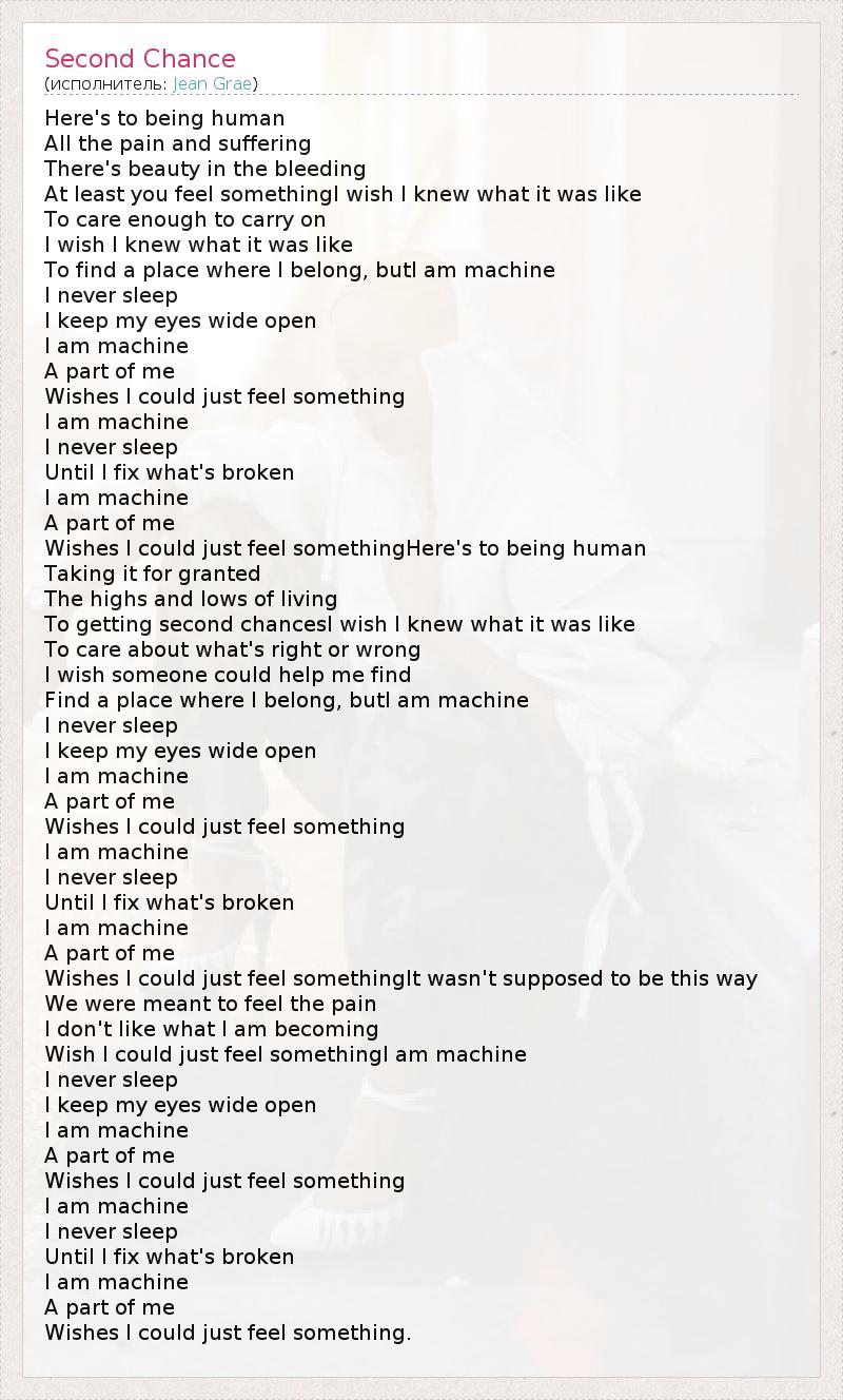 Here's to being human All the pain and suffering There's beauty in the bleeding At least you feel somethingI wish I knew what it was like To care enough to carry on I wish I knew what it was like To find a place where I belong, butI am machine I never sleep I keep my eyes wide open I am machine A part of me Wishes I could just feel something I am machine I never sleep Until I fix what's broken I am machine A part of me Wishes I could just feel somethingHere's to being human Taking it for granted The highs and lows of living To getting second chancesI wish I knew what it was like To care about what's right or wrong I wish someone could help me find Find a place where I belong, butI am machine I never sleep I keep my eyes wide open I am machine A part of me Wishes I could just feel something I am machine I never sleep Until I fix what's broken I am machine A part of me Wishes I could just feel somethingIt wasn't supposed to be this way We were meant to feel the pain I don't like what I am becoming Wish I could just feel somethingI am machine I never sleep I keep my eyes wide open I am machine A part of me Wishes I could just feel something I am machine I never sleep Until I fix what's broken I am machine A part of me Wishes I could just feel something.