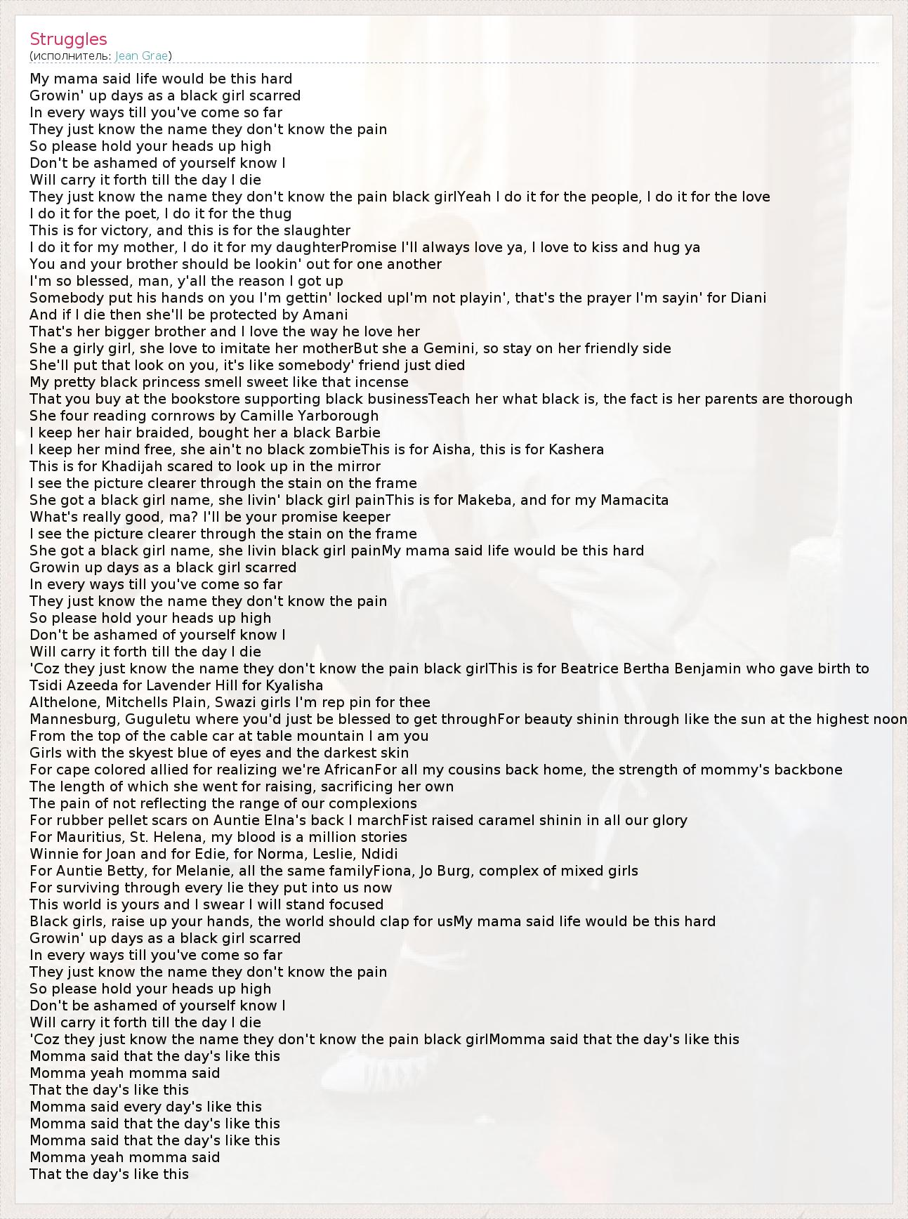 My mama said life would be this hard Growin' up days as a black girl scarred In every ways till you've come so far They just know the name they don't know the pain So please hold your heads up high Don't be ashamed of yourself know I Will carry it forth till the day I die They just know the name they don't know the pain black girlYeah I do it for the people, I do it for the love I do it for the poet, I do it for the thug This is for victory, and this is for the slaughter I do it for my mother, I do it for my daughterPromise I'll always love ya, I love to kiss and hug ya You and your brother should be lookin' out for one another I'm so blessed, man, y'all the reason I got up Somebody put his hands on you I'm gettin' locked upI'm not playin', that's the prayer I'm sayin' for Diani And if I die then she'll be protected by Amani That's her bigger brother and I love the way he love her She a girly girl, she love to imitate her motherBut she a Gemini, so stay on her friendly side She'll put that look on you, it's like somebody' friend just died My pretty black princess smell sweet like that incense That you buy at the bookstore supporting black businessTeach her what black is, the fact is her parents are thorough She four reading cornrows by Camille Yarborough I keep her hair braided, bought her a black Barbie I keep her mind free, she ain't no black zombieThis is for Aisha, this is for Kashera This is for Khadijah scared to look up in the mirror I see the picture clearer through the stain on the frame She got a black girl name, she livin' black girl painThis is for Makeba, and for my Mamacita What's really good, ma? I'll be your promise keeper I see the picture clearer through the stain on the frame She got a black girl name, she livin black girl painMy mama said life would be this hard Growin up days as a black girl scarred In every ways till you've come so far They just know the name they don't know the pain So please hold your heads up high Don't be ashamed of yourself know I Will carry it forth till the day I die 'Coz they just know the name they don't know the pain black girlThis is for Beatrice Bertha Benjamin who gave birth to Tsidi Azeeda for Lavender Hill for Kyalisha Althelone, Mitchells Plain, Swazi girls I'm rep pin for thee Mannesburg, Guguletu where you'd just be blessed to get throughFor beauty shinin through like the sun at the highest noon From the top of the cable car at table mountain I am you Girls with the skyest blue of eyes and the darkest skin For cape colored allied for realizing we're AfricanFor all my cousins back home, the strength of mommy's backbone The length of which she went for raising, sacrificing her own The pain of not reflecting the range of our complexions For rubber pellet scars on Auntie Elna's back I marchFist raised caramel shinin in all our glory For Mauritius, St. Helena, my blood is a million stories Winnie for Joan and for Edie, for Norma, Leslie, Ndidi For Auntie Betty, for Melanie, all the same familyFiona, Jo Burg, complex of mixed girls For surviving through every lie they put into us now This world is yours and I swear I will stand focused Black girls, raise up your hands, the world should clap for usMy mama said life would be this hard Growin' up days as a black girl scarred In every ways till you've come so far They just know the name they don't know the pain So please hold your heads up high Don't be ashamed of yourself know I Will carry it forth till the day I die 'Coz they just know the name they don't know the pain black girlMomma said that the day's like this Momma said that the day's like this Momma yeah momma said That the day's like this Momma said every day's like this Momma said that the day's like this Momma said that the day's like this Momma yeah momma said That the day's like this