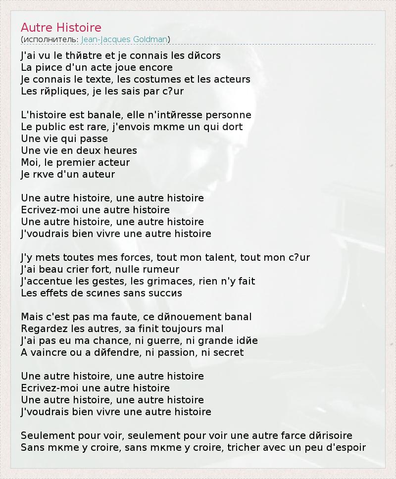 J'ai vu le thйвtre et je connais les dйcors La piиce d'un acte joue encore Je connais le texte, les costumes et les acteurs Les rйpliques, je les sais par c?ur L'histoire est banale, elle n'intйresse personne Le public est rare, j'envois mкme un qui dort Une vie qui passe Une vie en deux heures Moi, le premier acteur Je rкve d'un auteur Une autre histoire, une autre histoire Ecrivez-moi une autre histoire Une autre histoire, une autre histoire J'voudrais bien vivre une autre histoire J'y mets toutes mes forces, tout mon talent, tout mon c?ur J'ai beau crier fort, nulle rumeur J'accentue les gestes, les grimaces, rien n'y fait Les effets de scиnes sans succиs Mais c'est pas ma faute, ce dйnouement banal Regardez les autres, зa finit toujours mal J'ai pas eu ma chance, ni guerre, ni grande idйe A vaincre ou а dйfendre, ni passion, ni secret Une autre histoire, une autre histoire Ecrivez-moi une autre histoire Une autre histoire, une autre histoire J'voudrais bien vivre une autre histoire Seulement pour voir, seulement pour voir une autre farce dйrisoire Sans mкme y croire, sans mкme y croire, tricher avec un peu d'espoir