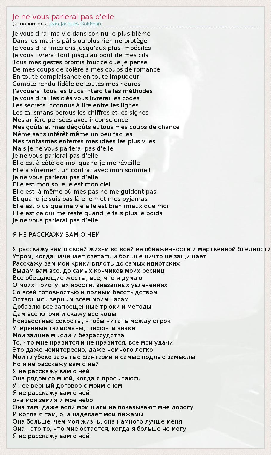 Je vous dirai ma vie dans son nu le plus blême Dans les matins pâlis ou plus rien ne protège Je vous dirai mes cris jusqu'aux plus imbéciles Je vous livrerai tout jusqu'au bout de mes cils Tous mes gestes promis tout ce que je pense De mes coups de colère à mes coups de romance En toute complaisance en toute impudeur Compte rendu fidèle de toutes mes heures J'avouerai tous les trucs interdite les méthodes Je vous dirai les clés vous livrerai les codes Les secrets inconnus à lire entre les lignes Les talismans perdus les chiffres et les signes Mes arrière pensées avec inconscience Mes goûts et mes dégoûts et tous mes coups de chance Même sans intérêt même un peu faciles Mes fantasmes enterres mes idées les plus viles Mais je ne vous parlerai pas d'elle Je ne vous parlerai pas d'elle Elle est à côté de moi quand je me réveille Elle a sûrement un contrat avec mon sommeil Je ne vous parlerai pas d'elle Elle est mon sol elle est mon ciel Elle est là même où mes pas ne me guident pas Et quand je suis pas là elle met mes pyjamas Elle est plus que ma vie elle est bien mieux que moi Elle est ce qui me reste quand je fais plus le poids Je ne vous parlerai pas d'elle Я НЕ РАССКАЖУ ВАМ О НЕЙ Я расскажу вам о своей жизни во всей ее обнаженности и мертвенной бледности Утром, когда начинает светать и больше ничто не защищает Расскажу вам мои крики вплоть до самых идиотских Выдам вам все, до самых кончиков моих ресниц Все обещающие жесты, все, что я думаю О моих приступах ярости, внезапных увлечениях Со всей готовностью и полным бесстыдством Оставшись верным всем моим часам Добавлю все запрещенные трюки и методы Дам все ключи и скажу все коды Неизвестные секреты, чтобы читать между строк Утерянные талисманы, шифры и знаки Мои задние мысли и безрассудства То, что мне нравится и не нравится, все мои удачи Это даже неинтересно, даже немного легко Мои глубоко зарытые фантазии и самые подлые замыслы Но я не расскажу вам о ней Я не расскажу вам о ней Она рядом со мной, когда я просыпаюсь У нее верный договор с моим сном Я не расскажу вам о ней она моя земля и мое небо Она там, даже если мои шаги не показывают мне дорогу И когда я там, она надевает мои пижамы Она больше, чем моя жизнь, она намного лучше меня Она - это то, что мне остается, когда я больше не могу Я не расскажу вам о ней