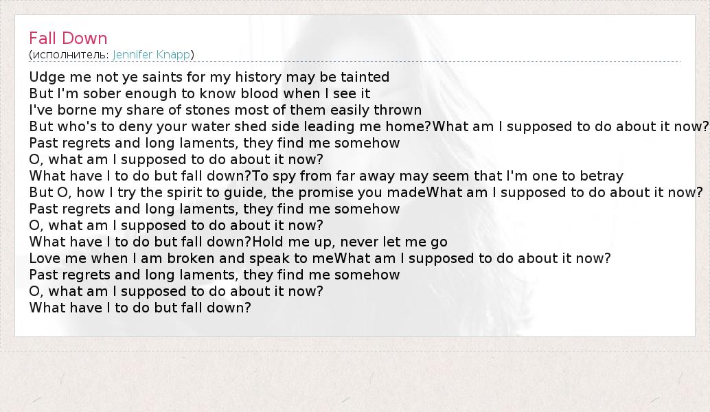 Udge me not ye saints for my history may be tainted But I'm sober enough to know blood when I see it I've borne my share of stones most of them easily thrown But who's to deny your water shed side leading me home?What am I supposed to do about it now? Past regrets and long laments, they find me somehow O, what am I supposed to do about it now? What have I to do but fall down?To spy from far away may seem that I'm one to betray But O, how I try the spirit to guide, the promise you madeWhat am I supposed to do about it now? Past regrets and long laments, they find me somehow O, what am I supposed to do about it now? What have I to do but fall down?Hold me up, never let me go Love me when I am broken and speak to meWhat am I supposed to do about it now? Past regrets and long laments, they find me somehow O, what am I supposed to do about it now? What have I to do but fall down?