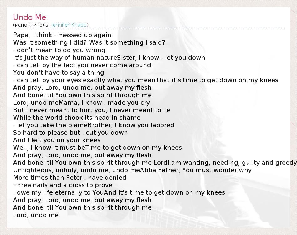 Papa, I think I messed up again Was it something I did? Was it something I said? I don't mean to do you wrong It's just the way of human natureSister, I know I let you down I can tell by the fact you never come around You don't have to say a thing I can tell by your eyes exactly what you meanThat it's time to get down on my knees And pray, Lord, undo me, put away my flesh And bone 'til You own this spirit through me Lord, undo meMama, I know I made you cry But I never meant to hurt you, I never meant to lie While the world shook its head in shame I let you take the blameBrother, I know you labored So hard to please but I cut you down And I left you on your knees Well, I know it must beTime to get down on my knees And pray, Lord, undo me, put away my flesh And bone 'til You own this spirit through me LordI am wanting, needing, guilty and greedy Unrighteous, unholy, undo me, undo meAbba Father, You must wonder why More times than Peter I have denied Three nails and a cross to prove I owe my life eternally to YouAnd it's time to get down on my knees And pray, Lord, undo me, put away my flesh And bone 'til You own this spirit through me Lord, undo me