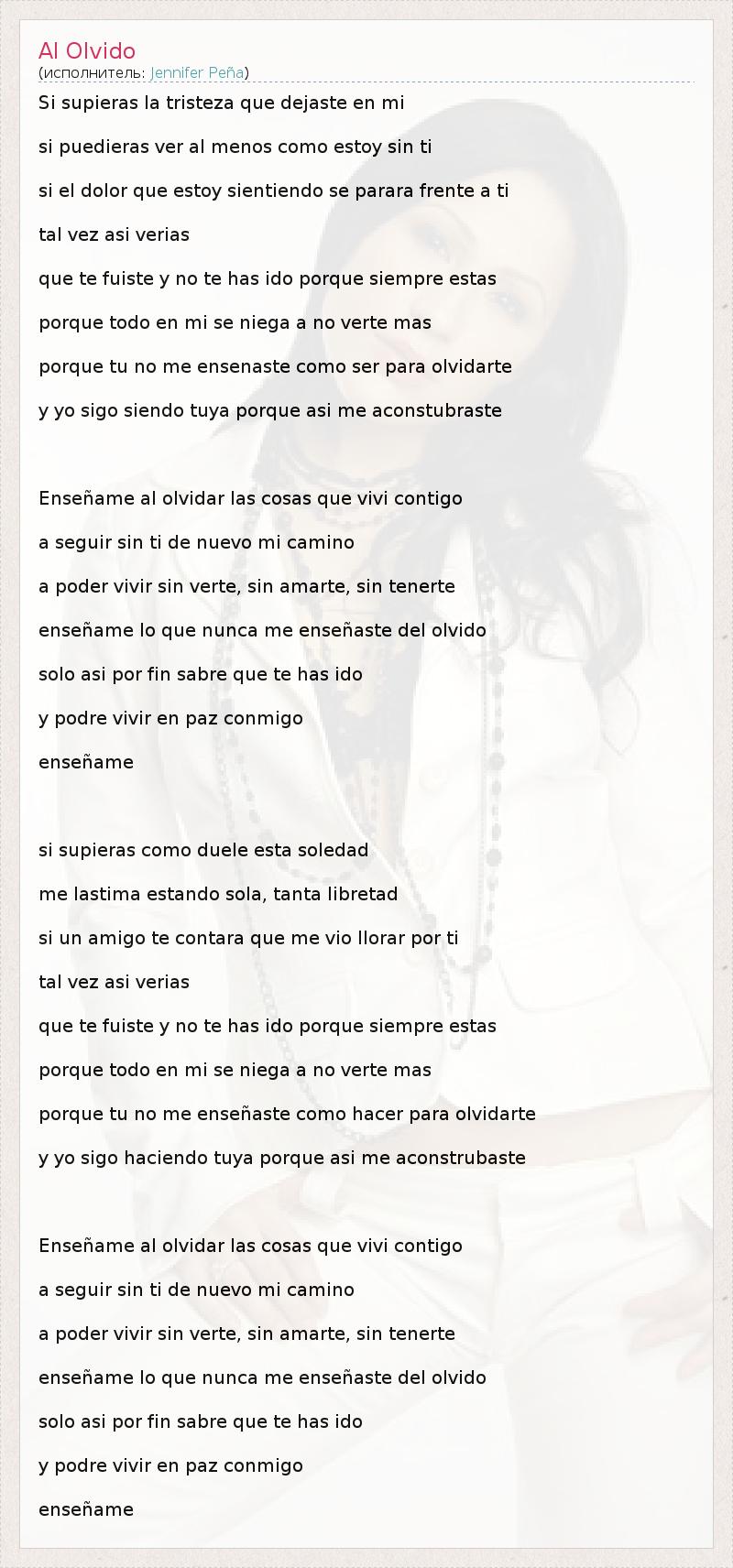 Si supieras la tristeza que dejaste en mi si puedieras ver al menos como estoy sin ti si el dolor que estoy sientiendo se parara frente a ti tal vez asi verias que te fuiste y no te has ido porque siempre estas porque todo en mi se niega a no verte mas porque tu no me ensenaste como ser para olvidarte y yo sigo siendo tuya porque asi me aconstubraste Enseñame al olvidar las cosas que vivi contigo a seguir sin ti de nuevo mi camino a poder vivir sin verte, sin amarte, sin tenerte enseñame lo que nunca me enseñaste del olvido solo asi por fin sabre que te has ido y podre vivir en paz conmigo enseñame si supieras como duele esta soledad me lastima estando sola, tanta libretad si un amigo te contara que me vio llorar por ti tal vez asi verias que te fuiste y no te has ido porque siempre estas porque todo en mi se niega a no verte mas porque tu no me enseñaste como hacer para olvidarte y yo sigo haciendo tuya porque asi me aconstrubaste Enseñame al olvidar las cosas que vivi contigo a seguir sin ti de nuevo mi camino a poder vivir sin verte, sin amarte, sin tenerte enseñame lo que nunca me enseñaste del olvido solo asi por fin sabre que te has ido y podre vivir en paz conmigo enseñame