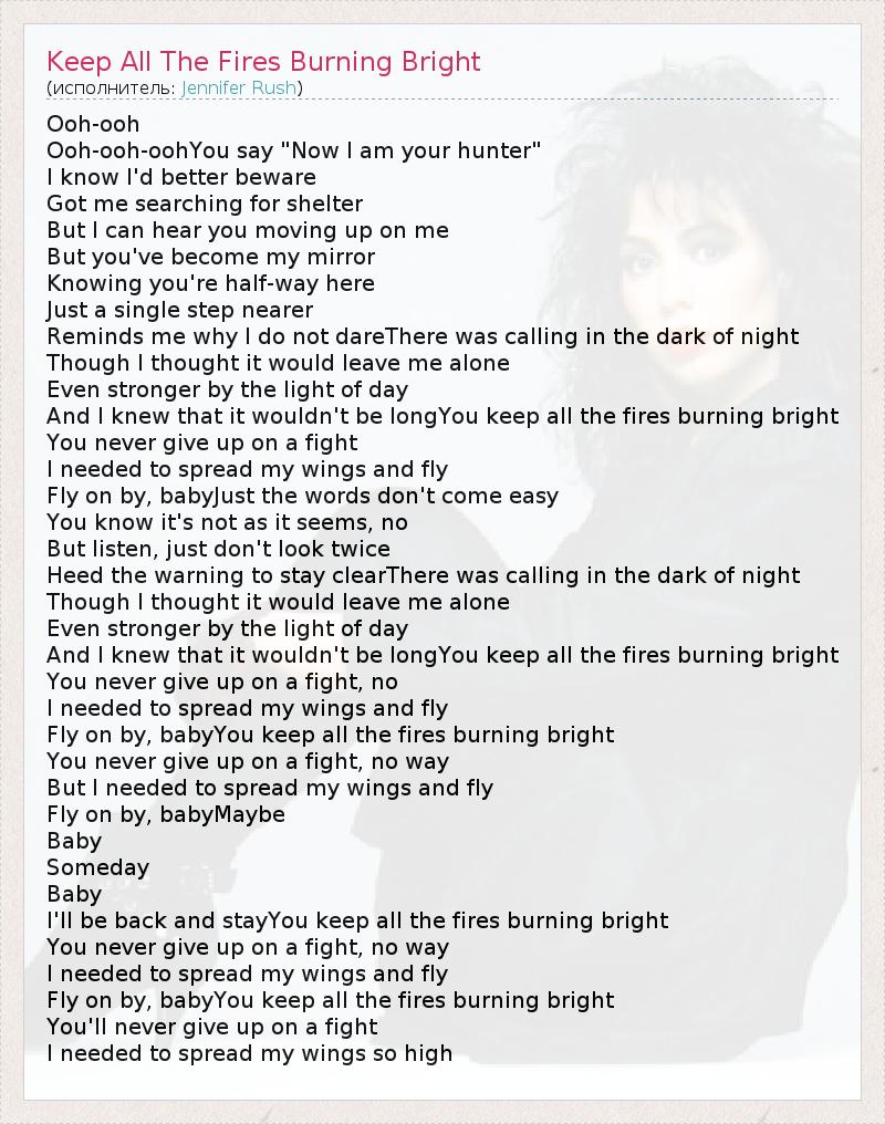 ГлавнаяИсполнителиJennifer RushKeep All The Fires Burning Bright