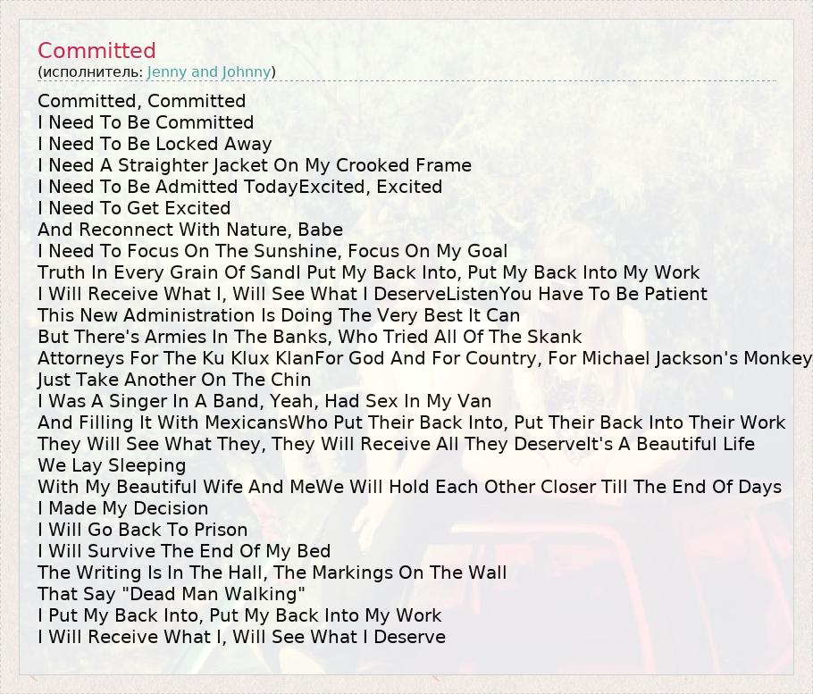 Committed, Committed I Need To Be Committed I Need To Be Locked Away I Need A Straighter Jacket On My Crooked Frame I Need To Be Admitted TodayExcited, Excited I Need To Get Excited And Reconnect With Nature, Babe I Need To Focus On The Sunshine, Focus On My Goal Truth In Every Grain Of SandI Put My Back Into, Put My Back Into My Work I Will Receive What I, Will See What I DeserveListenYou Have To Be Patient This New Administration Is Doing The Very Best It Can But There's Armies In The Banks, Who Tried All Of The Skank Attorneys For The Ku Klux KlanFor God And For Country, For Michael Jackson's Monkey Just Take Another On The Chin I Was A Singer In A Band, Yeah, Had Sex In My Van And Filling It With MexicansWho Put Their Back Into, Put Their Back Into Their Work They Will See What They, They Will Receive All They DeserveIt's A Beautiful Life We Lay Sleeping With My Beautiful Wife And MeWe Will Hold Each Other Closer Till The End Of Days I Made My Decision I Will Go Back To Prison I Will Survive The End Of My Bed The Writing Is In The Hall, The Markings On The Wall That Say "Dead Man Walking" I Put My Back Into, Put My Back Into My Work I Will Receive What I, Will See What I Deserve