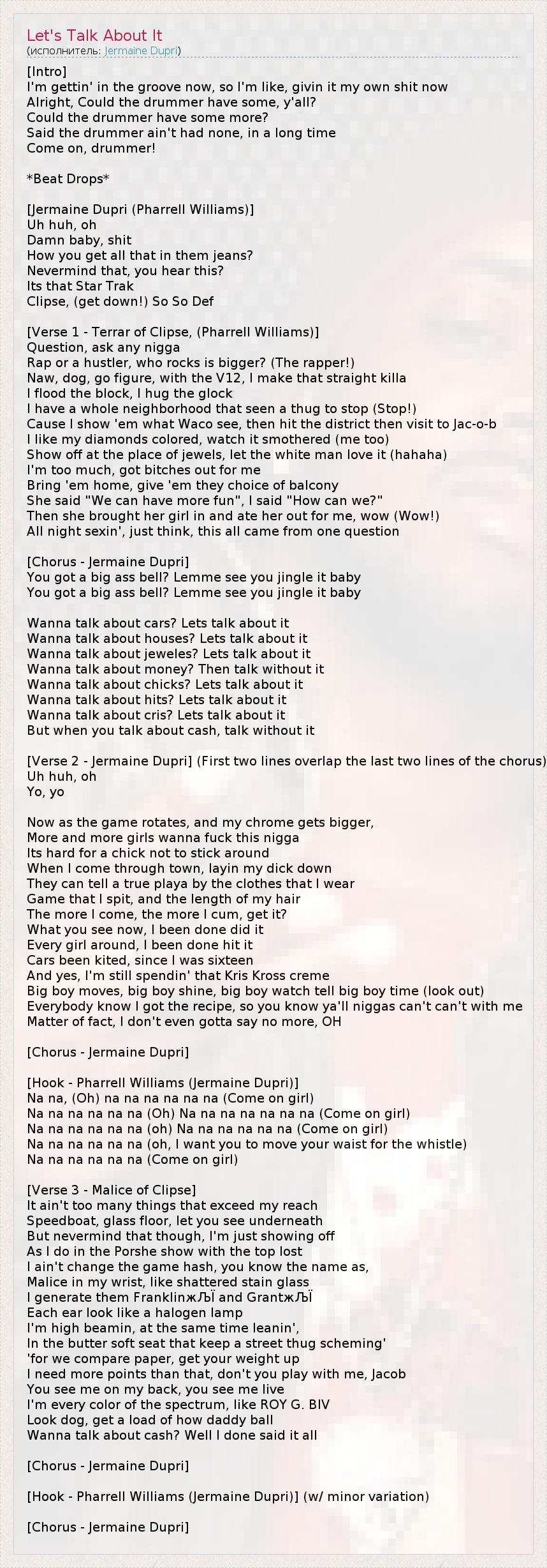[Intro] I'm gettin' in the groove now, so I'm like, givin it my own shit now Alright, Could the drummer have some, y'all? Could the drummer have some more? Said the drummer ain't had none, in a long time Come on, drummer! *Beat Drops* [Jermaine Dupri (Pharrell Williams)] Uh huh, oh Damn baby, shit How you get all that in them jeans? Nevermind that, you hear this? Its that Star Trak Clipse, (get down!) So So Def [Verse 1 - Terrar of Clipse, (Pharrell Williams)] Question, ask any nigga Rap or a hustler, who rocks is bigger? (The rapper!) Naw, dog, go figure, with the V12, I make that straight killa I flood the block, I hug the glock I have a whole neighborhood that seen a thug to stop (Stop!) Cause I show 'em what Waco see, then hit the district then visit to Jac-o-b I like my diamonds colored, watch it smothered (me too) Show off at the place of jewels, let the white man love it (hahaha) I'm too much, got bitches out for me Bring 'em home, give 'em they choice of balcony She said "We can have more fun", I said "How can we?" Then she brought her girl in and ate her out for me, wow (Wow!) All night sexin', just think, this all came from one question [Chorus - Jermaine Dupri] You got a big ass bell? Lemme see you jingle it baby You got a big ass bell? Lemme see you jingle it baby Wanna talk about cars? Lets talk about it Wanna talk about houses? Lets talk about it Wanna talk about jeweles? Lets talk about it Wanna talk about money? Then talk without it Wanna talk about chicks? Lets talk about it Wanna talk about hits? Lets talk about it Wanna talk about cris? Lets talk about it But when you talk about cash, talk without it [Verse 2 - Jermaine Dupri] (First two lines overlap the last two lines of the chorus) Uh huh, oh Yo, yo Now as the game rotates, and my chrome gets bigger, More and more girls wanna fuck this nigga Its hard for a chick not to stick around When I come through town, layin my dick down They can tell a true playa by the clothes that I wear Game that I spit, and the length of my hair The more I come, the more I cum, get it? What you see now, I been done did it Every girl around, I been done hit it Cars been kited, since I was sixteen And yes, I'm still spendin' that Kris Kross creme Big boy moves, big boy shine, big boy watch tell big boy time (look out) Everybody know I got the recipe, so you know ya'll niggas can't can't with me Matter of fact, I don't even gotta say no more, OH [Chorus - Jermaine Dupri] [Hook - Pharrell Williams (Jermaine Dupri)] Na na, (Oh) na na na na na na (Come on girl) Na na na na na na (Oh) Na na na na na na na (Come on girl) Na na na na na na (oh) Na na na na na na (Come on girl) Na na na na na na (oh, I want you to move your waist for the whistle) Na na na na na na (Come on girl) [Verse 3 - Malice of Clipse] It ain't too many things that exceed my reach Speedboat, glass floor, let you see underneath But nevermind that though, I'm just showing off As I do in the Porshe show with the top lost I ain't change the game hash, you know the name as, Malice in my wrist, like shattered stain glass I generate them FranklinжЉЇ and GrantжЉЇ Each ear look like a halogen lamp I'm high beamin, at the same time leanin', In the butter soft seat that keep a street thug scheming' 'for we compare paper, get your weight up I need more points than that, don't you play with me, Jacob You see me on my back, you see me live I'm every color of the spectrum, like ROY G. BIV Look dog, get a load of how daddy ball Wanna talk about cash? Well I done said it all [Chorus - Jermaine Dupri] [Hook - Pharrell Williams (Jermaine Dupri)] (w/ minor variation) [Chorus - Jermaine Dupri]