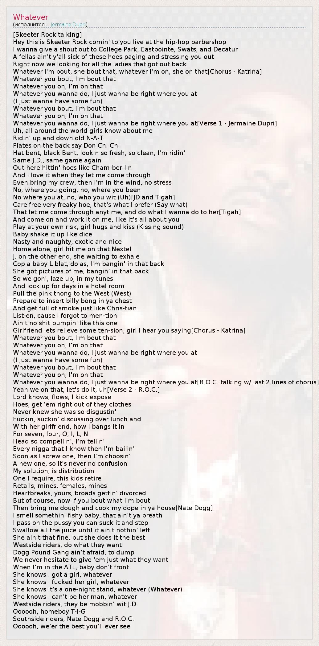 [Skeeter Rock talking] Hey this is Skeeter Rock comin' to you live at the hip-hop barbershop I wanna give a shout out to College Park, Eastpointe, Swats, and Decatur A fellas ain't y'all sick of these hoes paging and stressing you out Right now we looking for all the ladies that got out back Whatever I'm bout, she bout that, whatever I'm on, she on that[Chorus - Katrina] Whatever you bout, I'm bout that Whatever you on, I'm on that Whatever you wanna do, I just wanna be right where you at (I just wanna have some fun) Whatever you bout, I'm bout that Whatever you on, I'm on that Whatever you wanna do, I just wanna be right where you at[Verse 1 - Jermaine Dupri] Uh, all around the world girls know about me Ridin' up and down old N-A-T Plates on the back say Don Chi Chi Hat bent, black Bent, lookin so fresh, so clean, I'm ridin' Same J.D., same game again Out here hittin' hoes like Cham-ber-lin And I love it when they let me come through Even bring my crew, then I'm in the wind, no stress No, where you going, no, where you been No where you at, no, who you wit (Uh)[JD and Tigah] Care free very freaky hoe, that's what I prefer (Say what) That let me come through anytime, and do what I wanna do to her[Tigah] And come on and work it on me, like it's all about you Play at your own risk, girl hugs and kiss (Kissing sound) Baby shake it up like dice Nasty and naughty, exotic and nice Home alone, girl hit me on that Nextel J. on the other end, she waiting to exhale Cop a baby L blat, do as, I'm bangin' in that back She got pictures of me, bangin' in that back So we gon', laze up, in my tunes And lock up for days in a hotel room Pull the pink thong to the West (West) Prepare to insert billy bong in ya chest And get full of smoke just like Chris-tian List-en, cause I forgot to men-tion Ain't no shit bumpin' like this one Girlfriend lets relieve some ten-sion, girl I hear you saying[Chorus - Katrina] Whatever you bout, I'm bout that Whatever you on, I'm on that Whatever you wanna do, I just wanna be right where you at (I just wanna have some fun) Whatever you bout, I'm bout that Whatever you on, I'm on that Whatever you wanna do, I just wanna be right where you at[R.O.C. talking w/ last 2 lines of chorus] Yeah we on that, let's do it, uh[Verse 2 - R.O.C.] Lord knows, flows, I kick expose Hoes, get 'em right out of they clothes Never knew she was so disgustin' Fuckin, suckin' discussing over lunch and With her girlfriend, how I bangs it in For seven, four, O, I, L, N Head so compellin', I'm tellin' Every nigga that I know then I'm bailin' Soon as I screw one, then I'm choosin' A new one, so it's never no confusion My solution, is distribution One I require, this kids retire Retails, mines, females, mines Heartbreaks, yours, broads gettin' divorced But of course, now if you bout what I'm bout Then bring me dough and cook my dope in ya house[Nate Dogg] I smell somethin' fishy baby, that ain't ya breath I pass on the pussy you can suck it and step Swallow all the juice until it ain't nothin' left She ain't that fine, but she does it the best Westside riders, do what they want Dogg Pound Gang ain't afraid, to dump We never hesitate to give 'em just what they want When I'm in the ATL, baby don't front She knows I got a girl, whatever She knows I fucked her girl, whatever She knows it's a one-night stand, whatever (Whatever) She knows I can't be her man, whatever Westside riders, they be mobbin' wit J.D. Oooooh, homeboy T-I-G Southside riders, Nate Dogg and R.O.C. Oooooh, we'er the best you'll ever see