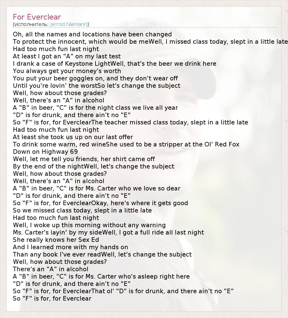 So "F" is for, for EverclearThat ol' "D" is for drunk, and there ain't no "E"