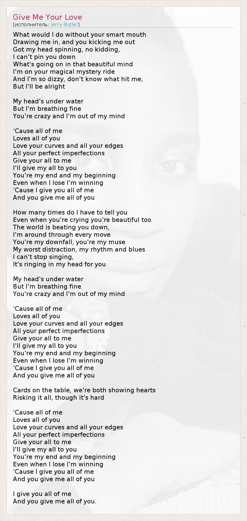 What would I do without your smart mouth Drawing me in, and you kicking me out Got my head spinning, no kidding, I can't pin you down What's going on in that beautiful mind I'm on your magical mystery ride And I'm so dizzy, don't know what hit me, But I'll be alright My head's under water But I'm breathing fine You're crazy and I'm out of my mind ‘Cause all of me Loves all of you Love your curves and all your edges All your perfect imperfections Give your all to me I'll give my all to you You're my end and my beginning Even when I lose I'm winning ‘Cause I give you all of me And you give me all of you How many times do I have to tell you Even when you're crying you're beautiful too The world is beating you down, I'm around through every move You're my downfall, you're my muse My worst distraction, my rhythm and blues I can't stop singing, It's ringing in my head for you My head's under water But I'm breathing fine You're crazy and I'm out of my mind ‘Cause all of me Loves all of you Love your curves and all your edges All your perfect imperfections Give your all to me I'll give my all to you You're my end and my beginning Even when I lose I'm winning ‘Cause I give you all of me And you give me all of you Cards on the table, we're both showing hearts Risking it all, though it's hard ‘Cause all of me Loves all of you Love your curves and all your edges All your perfect imperfections Give your all to me I'll give my all to you You're my end and my beginning Even when I lose I'm winning ‘Cause I give you all of me And you give me all of you I give you all of me And you give me all of you.