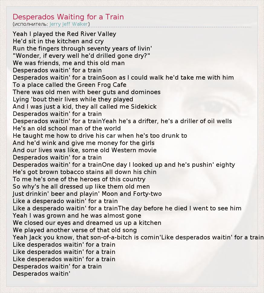 Yeah I played the Red River Valley He'd sit in the kitchen and cry Run the fingers through seventy years of livin' "Wonder, if every well he'd drilled gone dry?" We was friends, me and this old man Desperados waitin' for a train Desperados waitin' for a trainSoon as I could walk he'd take me with him To a place called the Green Frog Cafe There was old men with beer guts and dominoes Lying 'bout their lives while they played And I was just a kid, they all called me Sidekick Desperados waitin' for a train Desperados waitin' for a trainYeah he's a drifter, he's a driller of oil wells He's an old school man of the world He taught me how to drive his car when he's too drunk to And he'd wink and give me money for the girls And our lives was like, some old Western movie Desperados waitin' for a train Desperados waitin' for a trainOne day I looked up and he's pushin' eighty He's got brown tobacco stains all down his chin To me he's one of the heroes of this country So why's he all dressed up like them old men Just drinkin' beer and playin' Moon and Forty-two Like a desperado waitin' for a train Like a desperado waitin' for a trainThe day before he died I went to see him Yeah I was grown and he was almost gone We closed our eyes and dreamed us up a kitchen We played another verse of that old song Yeah Jack you know, that son-of-a-bitch is comin'Like desperados waitin' for a train Like desperados waitin' for a train Like desperados waitin' for a train Like desperados waitin' for a train Desperados waitin' for a train Desperados waitin'