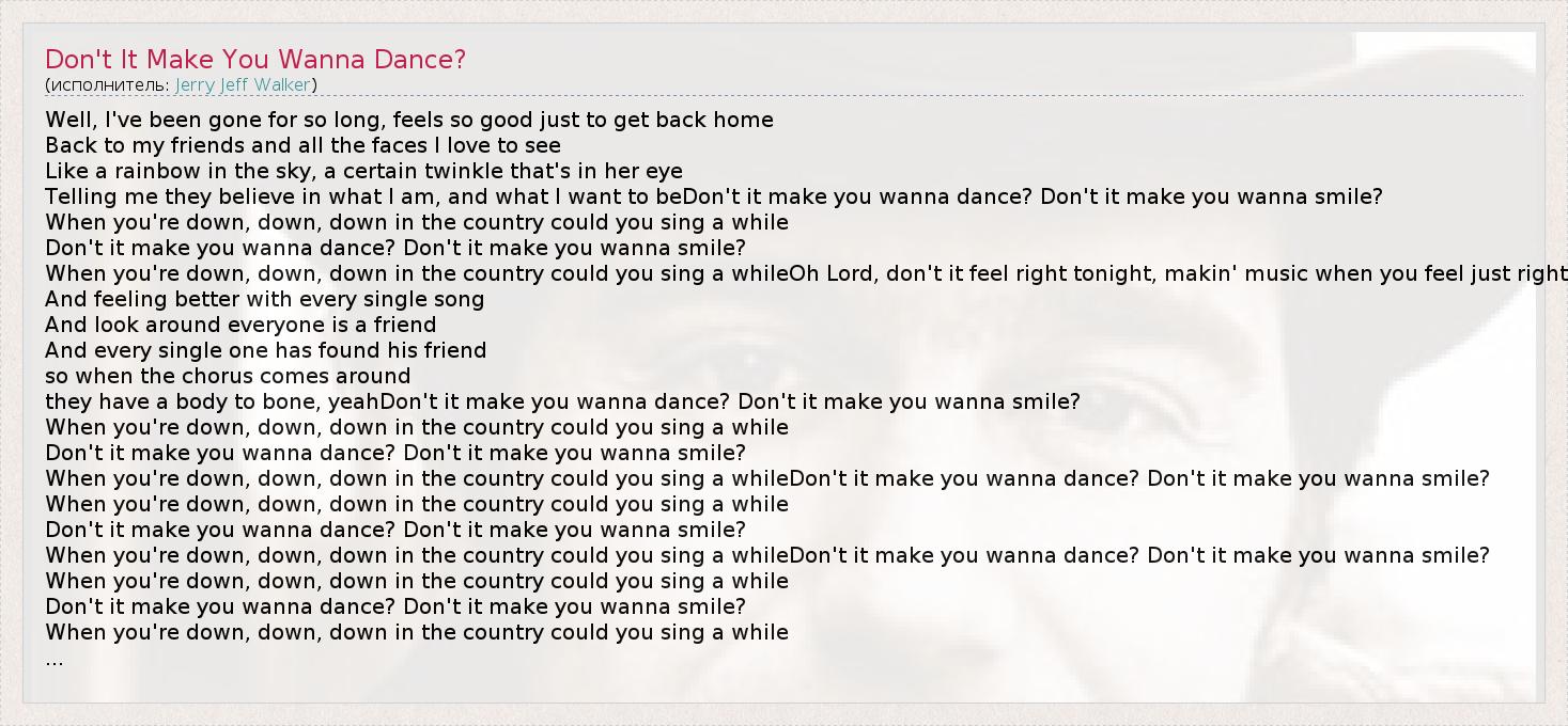 Well, I've been gone for so long, feels so good just to get back home Back to my friends and all the faces I love to see Like a rainbow in the sky, a certain twinkle that's in her eye Telling me they believe in what I am, and what I want to beDon't it make you wanna dance? Don't it make you wanna smile? When you're down, down, down in the country could you sing a while Don't it make you wanna dance? Don't it make you wanna smile? When you're down, down, down in the country could you sing a whileOh Lord, don't it feel right tonight, makin' music when you feel just right And feeling better with every single song And look around everyone is a friend And every single one has found his friend so when the chorus comes around they have a body to bone, yeahDon't it make you wanna dance? Don't it make you wanna smile? When you're down, down, down in the country could you sing a while Don't it make you wanna dance? Don't it make you wanna smile? When you're down, down, down in the country could you sing a whileDon't it make you wanna dance? Don't it make you wanna smile? When you're down, down, down in the country could you sing a while Don't it make you wanna dance? Don't it make you wanna smile? When you're down, down, down in the country could you sing a whileDon't it make you wanna dance? Don't it make you wanna smile? When you're down, down, down in the country could you sing a while Don't it make you wanna dance? Don't it make you wanna smile? When you're down, down, down in the country could you sing a while ...
