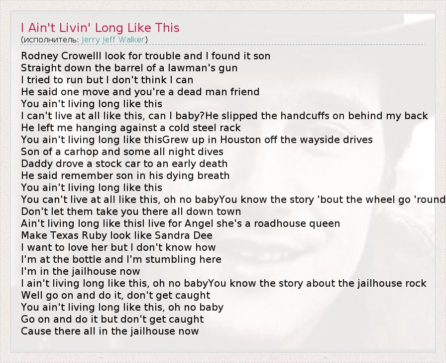 Rodney CrowellI look for trouble and I found it son Straight down the barrel of a lawman's gun I tried to run but I don't think I can He said one move and you're a dead man friend You ain't living long like this I can't live at all like this, can I baby?He slipped the handcuffs on behind my back He left me hanging against a cold steel rack You ain't living long like thisGrew up in Houston off the wayside drives Son of a carhop and some all night dives Daddy drove a stock car to an early death He said remember son in his dying breath You ain't living long like this You can't live at all like this, oh no babyYou know the story 'bout the wheel go 'round Don't let them take you there all down town Ain't living long like thisI live for Angel she's a roadhouse queen Make Texas Ruby look like Sandra Dee I want to love her but I don't know how I'm at the bottle and I'm stumbling here I'm in the jailhouse now I ain't living long like this, oh no babyYou know the story about the jailhouse rock Well go on and do it, don't get caught You ain't living long like this, oh no baby Go on and do it but don't get caught Cause there all in the jailhouse now