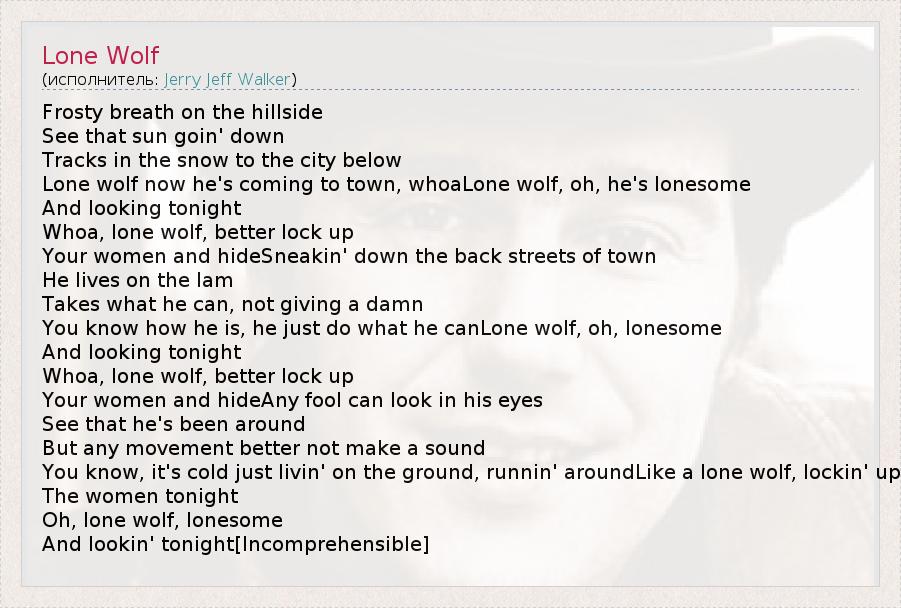 Frosty breath on the hillside See that sun goin' down Tracks in the snow to the city below Lone wolf now he's coming to town, whoaLone wolf, oh, he's lonesome And looking tonight Whoa, lone wolf, better lock up Your women and hideSneakin' down the back streets of town He lives on the lam Takes what he can, not giving a damn You know how he is, he just do what he canLone wolf, oh, lonesome And looking tonight Whoa, lone wolf, better lock up Your women and hideAny fool can look in his eyes See that he's been around But any movement better not make a sound You know, it's cold just livin' on the ground, runnin' aroundLike a lone wolf, lockin' up The women tonight Oh, lone wolf, lonesome And lookin' tonight[Incomprehensible]
