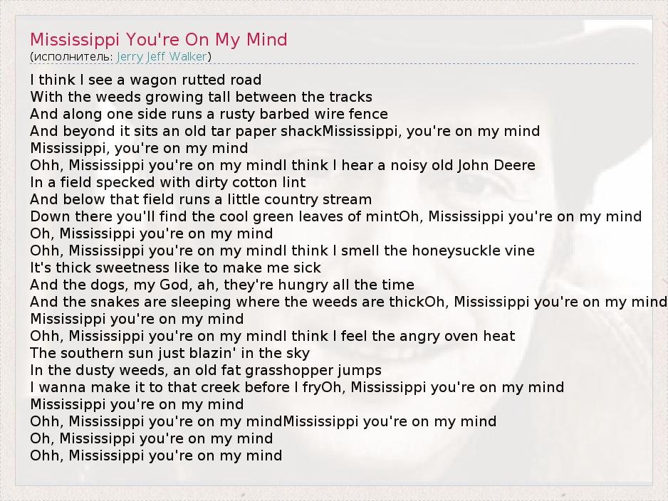 I think I see a wagon rutted road With the weeds growing tall between the tracks And along one side runs a rusty barbed wire fence And beyond it sits an old tar paper shackMississippi, you're on my mind Mississippi, you're on my mind Ohh, Mississippi you're on my mindI think I hear a noisy old John Deere In a field specked with dirty cotton lint And below that field runs a little country stream Down there you'll find the cool green leaves of mintOh, Mississippi you're on my mind Oh, Mississippi you're on my mind Ohh, Mississippi you're on my mindI think I smell the honeysuckle vine It's thick sweetness like to make me sick And the dogs, my God, ah, they're hungry all the time And the snakes are sleeping where the weeds are thickOh, Mississippi you're on my mind Mississippi you're on my mind Ohh, Mississippi you're on my mindI think I feel the angry oven heat The southern sun just blazin' in the sky In the dusty weeds, an old fat grasshopper jumps I wanna make it to that creek before I fryOh, Mississippi you're on my mind Mississippi you're on my mind Ohh, Mississippi you're on my mindMississippi you're on my mind Oh, Mississippi you're on my mind Ohh, Mississippi you're on my mind
