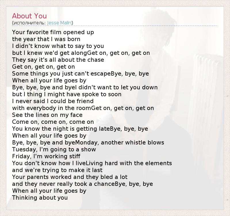 Your favorite film opened up the year that I was born I didn't know what to say to you but I knew we'd get alongGet on, get on, get on They say it's all about the chase Get on, get on, get on Some things you just can't escapeBye, bye, bye When all your life goes by Bye, bye, bye and byeI didn't want to let you down but I thing I might have spoke to soon I never said I could be friend with everybody in the roomGet on, get on, get on See the lines on my face Come on, come on, come on You know the night is getting lateBye, bye, bye When all your life goes by Bye, bye, bye and byeMonday, another whistle blows Tuesday, I'm going to a show Friday, I'm working stiff You don't know how I liveLiving hard with the elements and we're trying to make it last Your parents worked and they bled a lot and they never really took a chanceBye, bye, bye When all your life goes by Thinking about you