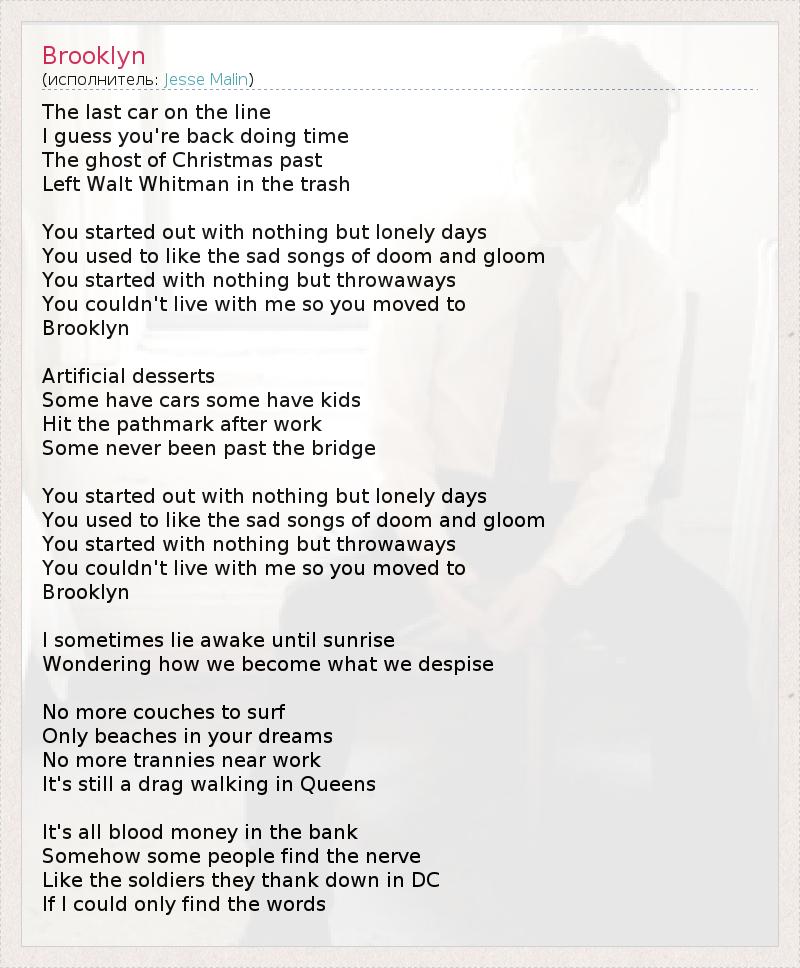 The last car on the line I guess you're back doing time The ghost of Christmas past Left Walt Whitman in the trash You started out with nothing but lonely days You used to like the sad songs of doom and gloom You started with nothing but throwaways You couldn't live with me so you moved to Brooklyn Artificial desserts Some have cars some have kids Hit the pathmark after work Some never been past the bridge You started out with nothing but lonely days You used to like the sad songs of doom and gloom You started with nothing but throwaways You couldn't live with me so you moved to Brooklyn I sometimes lie awake until sunrise Wondering how we become what we despise No more couches to surf Only beaches in your dreams No more trannies near work It's still a drag walking in Queens It's all blood money in the bank Somehow some people find the nerve Like the soldiers they thank down in DC If I could only find the words