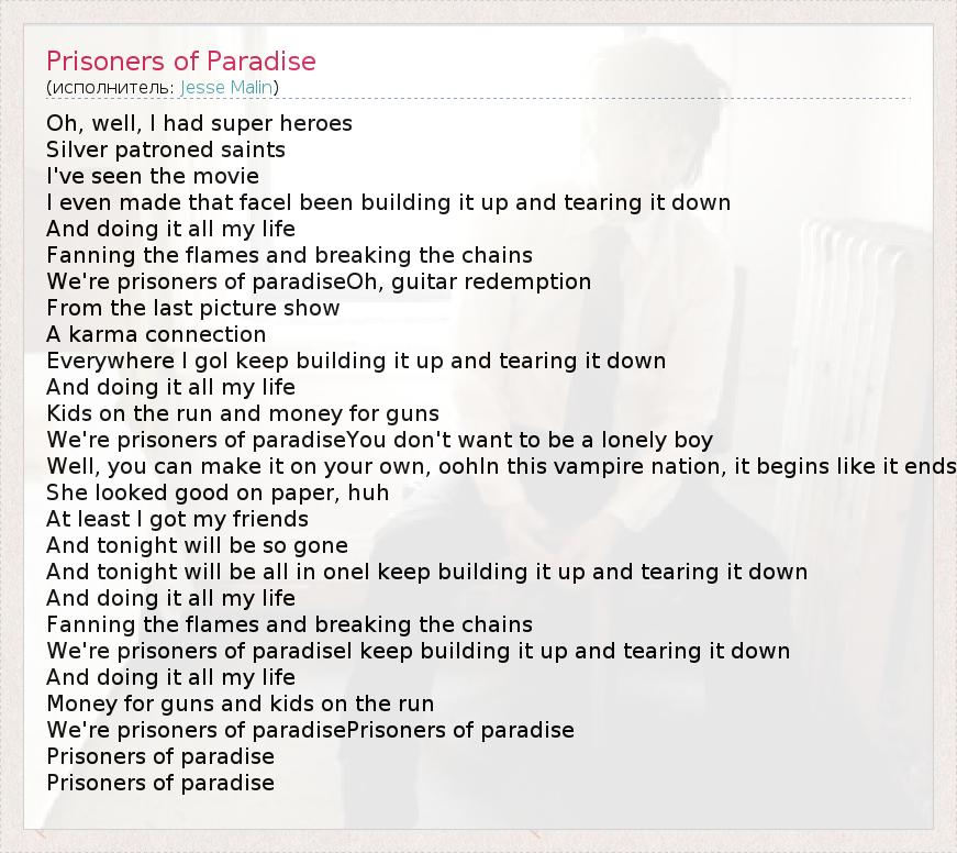 Oh, well, I had super heroes Silver patroned saints I've seen the movie I even made that faceI been building it up and tearing it down And doing it all my life Fanning the flames and breaking the chains We're prisoners of paradiseOh, guitar redemption From the last picture show A karma connection Everywhere I goI keep building it up and tearing it down And doing it all my life Kids on the run and money for guns We're prisoners of paradiseYou don't want to be a lonely boy Well, you can make it on your own, oohIn this vampire nation, it begins like it ends She looked good on paper, huh At least I got my friends And tonight will be so gone And tonight will be all in oneI keep building it up and tearing it down And doing it all my life Fanning the flames and breaking the chains We're prisoners of paradiseI keep building it up and tearing it down And doing it all my life Money for guns and kids on the run We're prisoners of paradisePrisoners of paradise Prisoners of paradise Prisoners of paradise