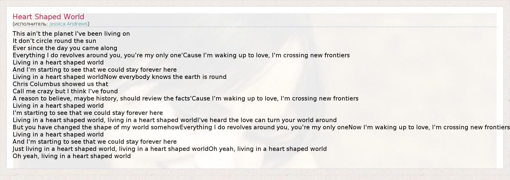 This ain't the planet I've been living on It don't circle round the sun Ever since the day you came along Everything I do revolves around you, you're my only one'Cause I'm waking up to love, I'm crossing new frontiers Living in a heart shaped world And I'm starting to see that we could stay forever here Living in a heart shaped worldNow everybody knows the earth is round Chris Columbus showed us that Call me crazy but I think I've found A reason to believe, maybe history, should review the facts'Cause I'm waking up to love, I'm crossing new frontiers Living in a heart shaped world I'm starting to see that we could stay forever here Living in a heart shaped world, living in a heart shaped worldI've heard the love can turn your world around But you have changed the shape of my world somehowEverything I do revolves around you, you're my only oneNow I'm waking up to love, I'm crossing new frontiers Living in a heart shaped world And I'm starting to see that we could stay forever here Just living in a heart shaped world, living in a heart shaped worldOh yeah, living in a heart shaped world Oh yeah, living in a heart shaped world