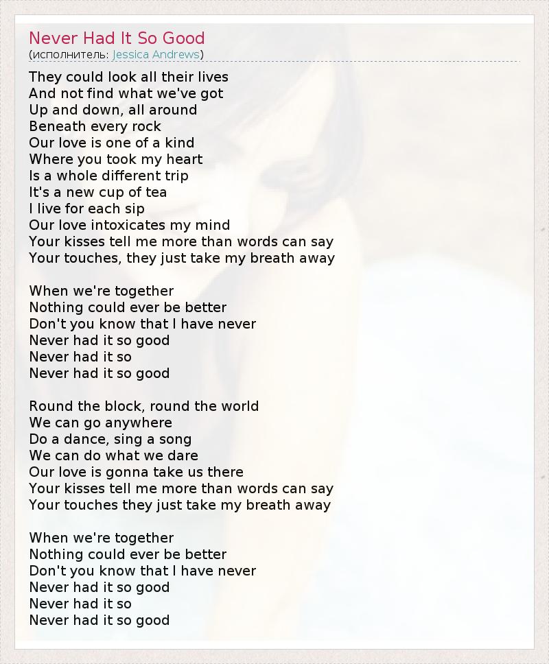 They could look all their lives And not find what we've got Up and down, all around Beneath every rock Our love is one of a kind Where you took my heart Is a whole different trip It's a new cup of tea I live for each sip Our love intoxicates my mind Your kisses tell me more than words can say Your touches, they just take my breath away When we're together Nothing could ever be better Don't you know that I have never Never had it so good Never had it so Never had it so good Round the block, round the world We can go anywhere Do a dance, sing a song We can do what we dare Our love is gonna take us there Your kisses tell me more than words can say Your touches they just take my breath away When we're together Nothing could ever be better Don't you know that I have never Never had it so good Never had it so Never had it so good