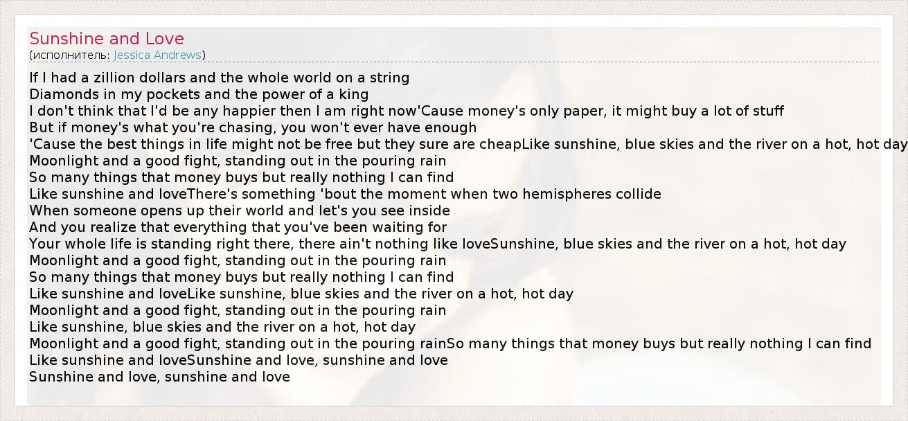 If I had a zillion dollars and the whole world on a string Diamonds in my pockets and the power of a king I don't think that I'd be any happier then I am right now'Cause money's only paper, it might buy a lot of stuff But if money's what you're chasing, you won't ever have enough 'Cause the best things in life might not be free but they sure are cheapLike sunshine, blue skies and the river on a hot, hot day Moonlight and a good fight, standing out in the pouring rain So many things that money buys but really nothing I can find Like sunshine and loveThere's something 'bout the moment when two hemispheres collide When someone opens up their world and let's you see inside And you realize that everything that you've been waiting for Your whole life is standing right there, there ain't nothing like loveSunshine, blue skies and the river on a hot, hot day Moonlight and a good fight, standing out in the pouring rain So many things that money buys but really nothing I can find Like sunshine and loveLike sunshine, blue skies and the river on a hot, hot day Moonlight and a good fight, standing out in the pouring rain Like sunshine, blue skies and the river on a hot, hot day Moonlight and a good fight, standing out in the pouring rainSo many things that money buys but really nothing I can find Like sunshine and loveSunshine and love, sunshine and love Sunshine and love, sunshine and love