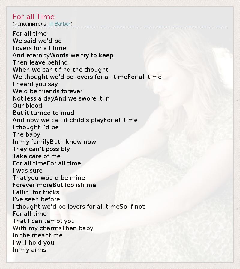 For all time We said we'd be Lovers for all time And eternityWords we try to keep Then leave behind When we can't find the thought We thought we'd be lovers for all timeFor all time I heard you say We'd be friends forever Not less a dayAnd we swore it in Our blood But it turned to mud And now we call it child's playFor all time I thought I'd be The baby In my familyBut I know now They can't possibly Take care of me For all timeFor all time I was sure That you would be mine Forever moreBut foolish me Fallin' for tricks I've seen before I thought we'd be lovers for all timeSo if not For all time That I can tempt you With my charmsThen baby In the meantime I will hold you In my arms