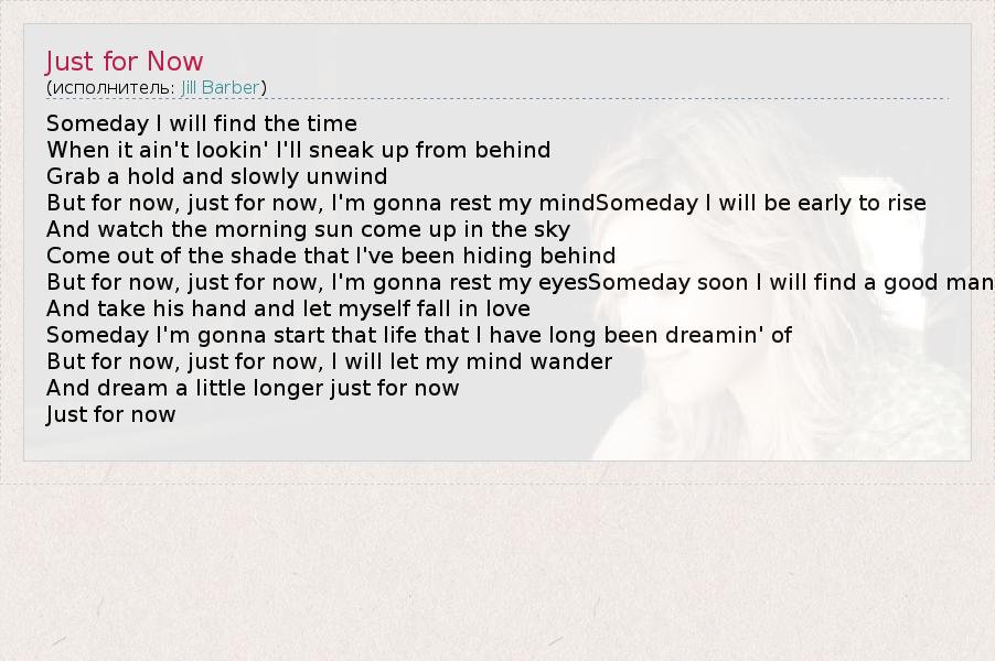 Someday I will find the time When it ain't lookin' I'll sneak up from behind Grab a hold and slowly unwind But for now, just for now, I'm gonna rest my mindSomeday I will be early to rise And watch the morning sun come up in the sky Come out of the shade that I've been hiding behind But for now, just for now, I'm gonna rest my eyesSomeday soon I will find a good man And take his hand and let myself fall in love Someday I'm gonna start that life that I have long been dreamin' of But for now, just for now, I will let my mind wander And dream a little longer just for now Just for now