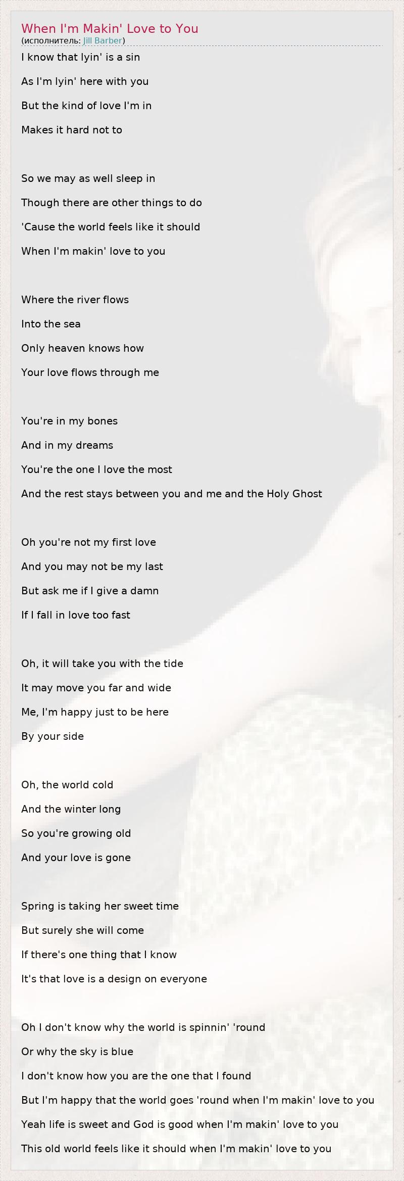 I know that lyin' is a sin As I'm lyin' here with you But the kind of love I'm in Makes it hard not to So we may as well sleep in Though there are other things to do 'Cause the world feels like it should When I'm makin' love to you Where the river flows Into the sea Only heaven knows how Your love flows through me You're in my bones And in my dreams You're the one I love the most And the rest stays between you and me and the Holy Ghost Oh you're not my first love And you may not be my last But ask me if I give a damn If I fall in love too fast Oh, it will take you with the tide It may move you far and wide Me, I'm happy just to be here By your side Oh, the world cold And the winter long So you're growing old And your love is gone Spring is taking her sweet time But surely she will come If there's one thing that I know It's that love is a design on everyone Oh I don't know why the world is spinnin' 'round Or why the sky is blue I don't know how you are the one that I found But I'm happy that the world goes 'round when I'm makin' love to you Yeah life is sweet and God is good when I'm makin' love to you This old world feels like it should when I'm makin' love to you
