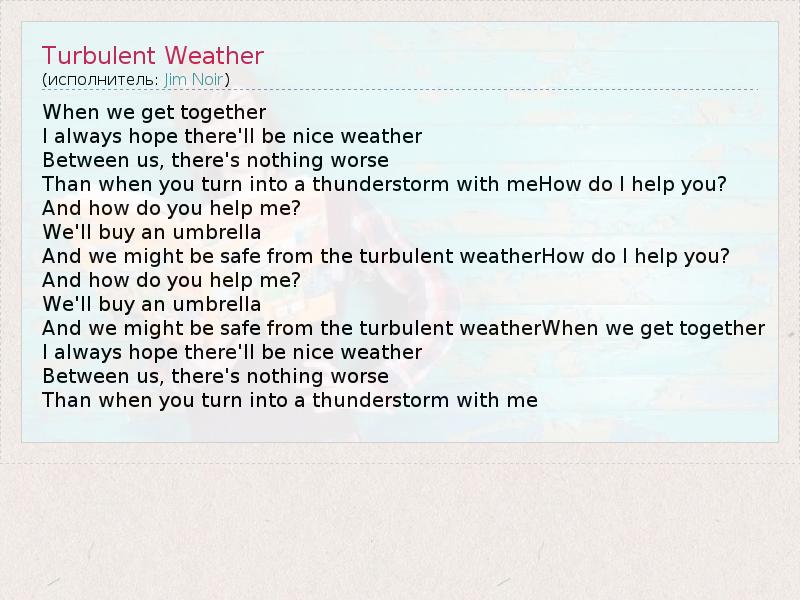 When we get together I always hope there'll be nice weather Between us, there's nothing worse Than when you turn into a thunderstorm with meHow do I help you? And how do you help me? We'll buy an umbrella And we might be safe from the turbulent weatherHow do I help you? And how do you help me? We'll buy an umbrella And we might be safe from the turbulent weatherWhen we get together I always hope there'll be nice weather Between us, there's nothing worse Than when you turn into a thunderstorm with me