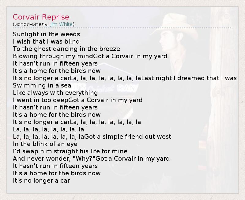 Sunlight in the weeds I wish that I was blind To the ghost dancing in the breeze Blowing through my mindGot a Corvair in my yard It hasn't run in fifteen years It's a home for the birds now It's no longer a carLa, la, la, la, la, la, la, laLast night I dreamed that I was Swimming in a sea Like always with everything I went in too deepGot a Corvair in my yard It hasn't run in fifteen years It's a home for the birds now It's no longer a carLa, la, la, la, la, la, la, la La, la, la, la, la, la, la, la La, la, la, la, la, la, la, laGot a simple friend out west In the blink of an eye I'd swap him straight his life for mine And never wonder, "Why?"Got a Corvair in my yard It hasn't run in fifteen years It's a home for the birds now It's no longer a car