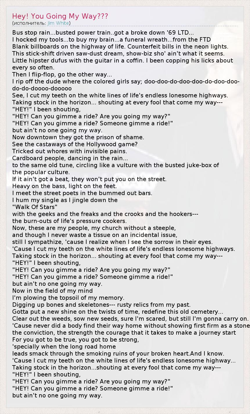 Bus stop rain...busted power train..got a broke down '69 LTD... I hocked my tools...to buy my brain...a funeral wreath...from the FTD Blank billboards on the highway of life. Counterfeit bills in the neon lights. This stick-shift driven saw-dust dream, show-biz sho' ain't what it seems. Little hipster dufus with the guitar in a coffin. I been copping his licks about every so often. Then I flip-flop, go the other way... I rip off the dude where the colored girls say; doo-doo-do-doo-doo-do-doo-doo- do-do-doooo-dooooo See, I cut my teeth on the white lines of life's endless lonesome highways. Taking stock in the horizon... shouting at every fool that come my way--- "HEY!" I been shouting, "HEY! Can you gimme a ride? Are you going my way?" "HEY! Can you gimme a ride? Someone gimme a ride!" but ain't no one going my way. Now downtown they got the prison of shame. See the castaways of the Hollywood game? Tricked out whores with invisible pains. Cardboard people, dancing in the rain... to the same old tune, circling like a vulture with the busted juke-box of the popular culture. If it ain't got a beat, they won't put you on the street. Heavy on the bass, light on the feet. I meet the street poets in the bummed out bars. I hum my single as I jingle down the "Walk Of Stars" with the geeks and the freaks and the crooks and the hookers--- the burn-outs of life's pressure cookers. Now, these are my people, my church without a steeple, and though I never waste a tissue on an incidental issue, still I sympathize, 'cause I realize when I see the sorrow in their eyes. 'Cause I cut my teeth on the white lines of life's endless lonesome highways. Taking stock in the horizon... shouting at every fool that come my way--- "HEY!" I been shouting, "HEY! Can you gimme a ride? Are you going my way?" "HEY! Can you gimme a ride? Someone gimme a ride!" but ain't no one going my way. Now in the field of my mind I'm plowing the topsoil of my memory. Digging up bones and skeletones--- rusty relics from my past. Gotta put a new shine on the twists of time, redefine this old cemetery... Clear out the weeds, sow new seeds, sure I'm scared, but still I'm gonna carry on. 'Cause never did a body find their way home without showing first firm as a stone the conviction, the strength the courage that it takes to make a journey start For you got to be true, you got to be strong, 'specially when the long road home leads smack through the smoking ruins of your broken heart.And I know. 'Cause I cut my teeth on the white lines of life's endless lonesome highway... Taking stock in the horizon...shouting at every fool that come my way--- "HEY!" I been shouting, "HEY! Can you gimme a ride? Are you going my way?" "HEY! Can you gimme a ride? Someone gimme a ride!" but ain't no one going my way.