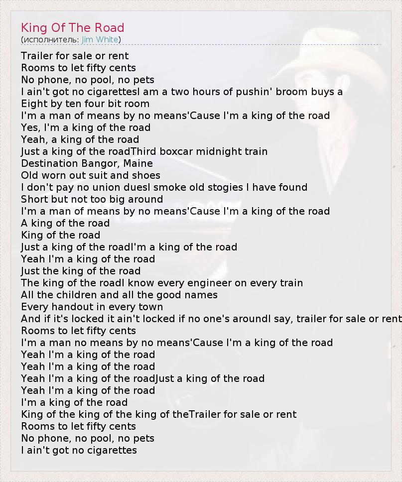 Trailer for sale or rent Rooms to let fifty cents No phone, no pool, no pets I ain't got no cigarettesI am a two hours of pushin' broom buys a Eight by ten four bit room I'm a man of means by no means'Cause I'm a king of the road Yes, I'm a king of the road Yeah, a king of the road Just a king of the roadThird boxcar midnight train Destination Bangor, Maine Old worn out suit and shoes I don't pay no union duesI smoke old stogies I have found Short but not too big around I'm a man of means by no means'Cause I'm a king of the road A king of the road King of the road Just a king of the roadI'm a king of the road Yeah I'm a king of the road Just the king of the road The king of the roadI know every engineer on every train All the children and all the good names Every handout in every town And if it's locked it ain't locked if no one's aroundI say, trailer for sale or rent Rooms to let fifty cents I'm a man no means by no means'Cause I'm a king of the road Yeah I'm a king of the road Yeah I'm a king of the road Yeah I'm a king of the roadJust a king of the road Yeah I'm a king of the road I'm a king of the road King of the king of the king of theTrailer for sale or rent Rooms to let fifty cents No phone, no pool, no pets I ain't got no cigarettes