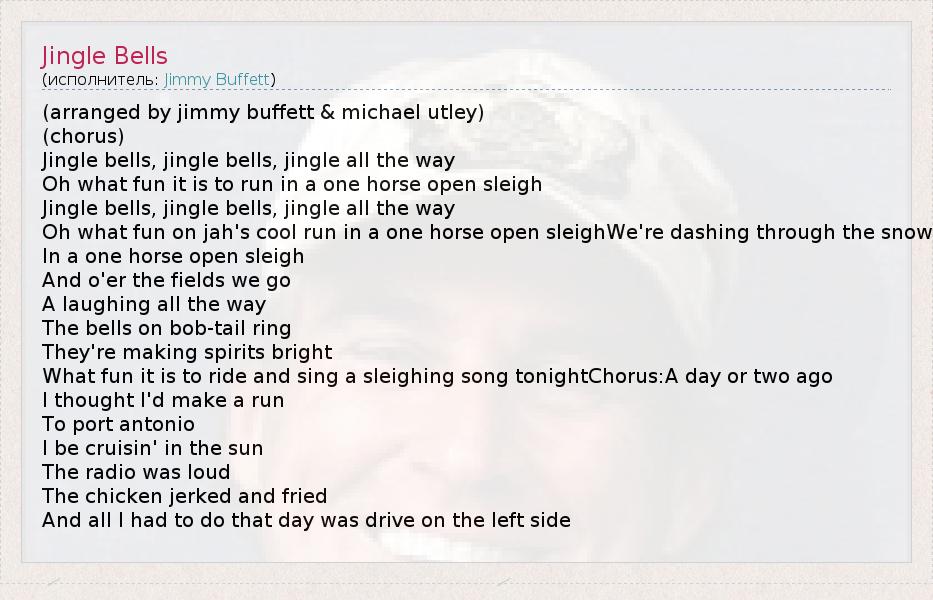 (arranged by jimmy buffett & michael utley) (chorus) Jingle bells, jingle bells, jingle all the way Oh what fun it is to run in a one horse open sleigh Jingle bells, jingle bells, jingle all the way Oh what fun on jah's cool run in a one horse open sleighWe're dashing through the snow In a one horse open sleigh And o'er the fields we go A laughing all the way The bells on bob-tail ring They're making spirits bright What fun it is to ride and sing a sleighing song tonightChorus:A day or two ago I thought I'd make a run To port antonio I be cruisin' in the sun The radio was loud The chicken jerked and fried And all I had to do that day was drive on the left side