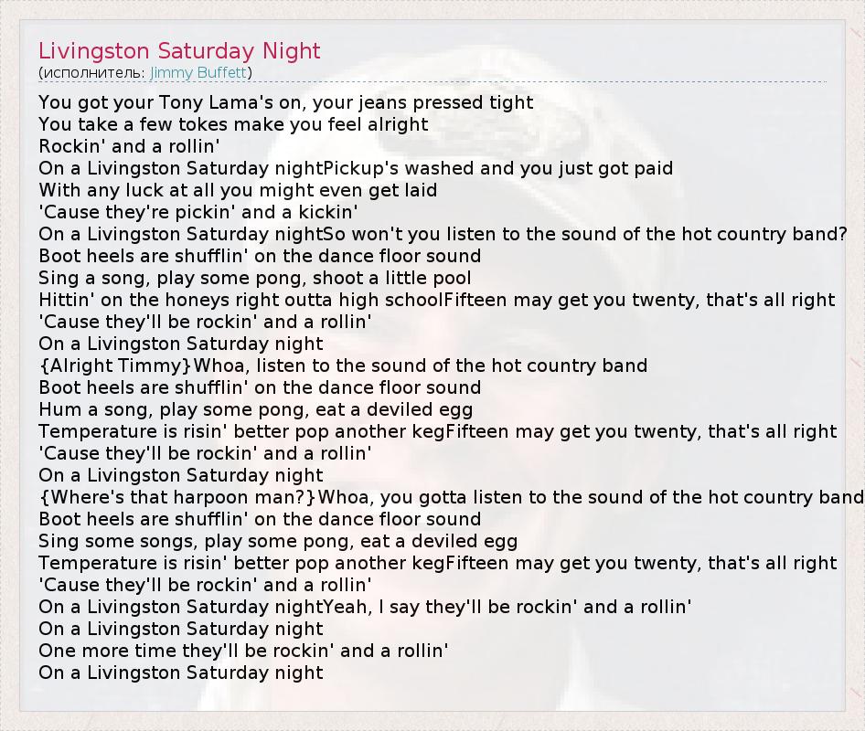 А как ты думаешь, о чем песня "Livingston Saturday Night" ?