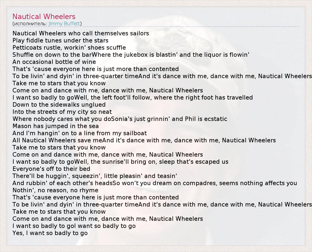 To be livin' and dyin' in three-quarter timeAnd it's dance with me, dance with me, Nautical Wheelers