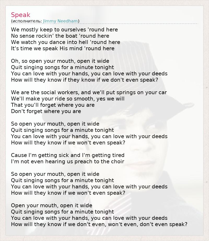 We mostly keep to ourselves 'round here No sense rockin' the boat 'round here We watch you dance into hell 'round here It's time we speak His mind 'round here Oh, so open your mouth, open it wide Quit singing songs for a minute tonight You can love with your hands, you can love with your deeds How will they know if they know if we don't even speak? We are the social workers, and we'll put springs on your car We'll make your ride so smooth, yes we will That you'll forget where you are Don't forget where you are So open your mouth, open it wide Quit singing songs for a minute tonight You can love with your hands, you can love with your deeds How will they know if we won't even speak? Cause I'm getting sick and I'm getting tired I'm not even hearing us preach to the choir So open your mouth, open it wide Quit singing songs for a minute tonight You can love with your hands, you can love with your deeds How will they know if we won't even speak? Open your mouth, open it wide Quit singing songs for a minute tonight You can love with your hands, you can love with your deeds How will they know if we don't even, won't even, don't even speak?