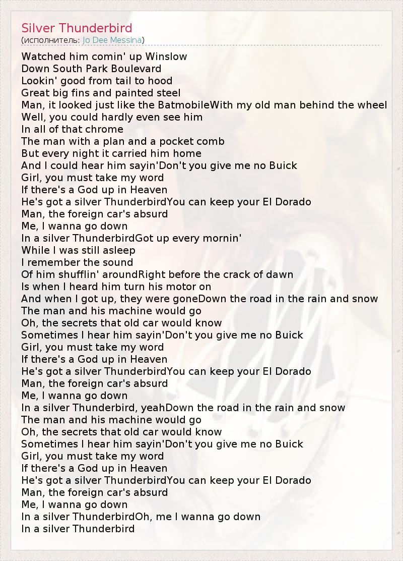 Watched him comin' up Winslow Down South Park Boulevard Lookin' good from tail to hood Great big fins and painted steel Man, it looked just like the BatmobileWith my old man behind the wheel Well, you could hardly even see him In all of that chrome The man with a plan and a pocket comb But every night it carried him home And I could hear him sayin'Don't you give me no Buick Girl, you must take my word If there's a God up in Heaven He's got a silver ThunderbirdYou can keep your El Dorado Man, the foreign car's absurd Me, I wanna go down In a silver ThunderbirdGot up every mornin' While I was still asleep I remember the sound Of him shufflin' aroundRight before the crack of dawn Is when I heard him turn his motor on And when I got up, they were goneDown the road in the rain and snow The man and his machine would go Oh, the secrets that old car would know Sometimes I hear him sayin'Don't you give me no Buick Girl, you must take my word If there's a God up in Heaven He's got a silver ThunderbirdYou can keep your El Dorado Man, the foreign car's absurd Me, I wanna go down In a silver Thunderbird, yeahDown the road in the rain and snow The man and his machine would go Oh, the secrets that old car would know Sometimes I hear him sayin'Don't you give me no Buick Girl, you must take my word If there's a God up in Heaven He's got a silver ThunderbirdYou can keep your El Dorado Man, the foreign car's absurd Me, I wanna go down In a silver ThunderbirdOh, me I wanna go down In a silver Thunderbird