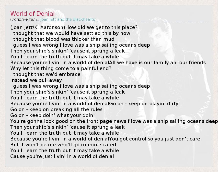 (Joan Jett/K. Aaronson)How did we get to this place? I thought that we would have settled this by now I thought that blood was thicker than mud I guess I was wrongIf love was a ship sailing oceans deep Then your ship's sinkin' 'cause it sprung a leak You'll learn the truth but it may take a while Because you're livin' in a world of denialAll we have is our family an' our friends Why let this thing come to a painful end? I thought that we'd embrace Instead we pull away I guess I was wrongIf love was a ship sailing oceans deep Then your ship's sinkin' 'cause it sprung a leak You'll learn the truth but it may take a while Because you're livin' in a world of denialGo on - keep on playin' dirty Go on - keep on breaking all the rules Go on - keep doin' what your doin' You're gonna look good on the front page newsIf love was a ship sailing oceans deep Then your ship's sinkin' 'cause it sprung a leak You'll learn the truth but it may take a while Because you're livin' in a world of denialYou got control so you just don't care But it won't be me who'll go runnin' scared You'll learn the truth but it may take a while Cause you're just livin' in a world of denial