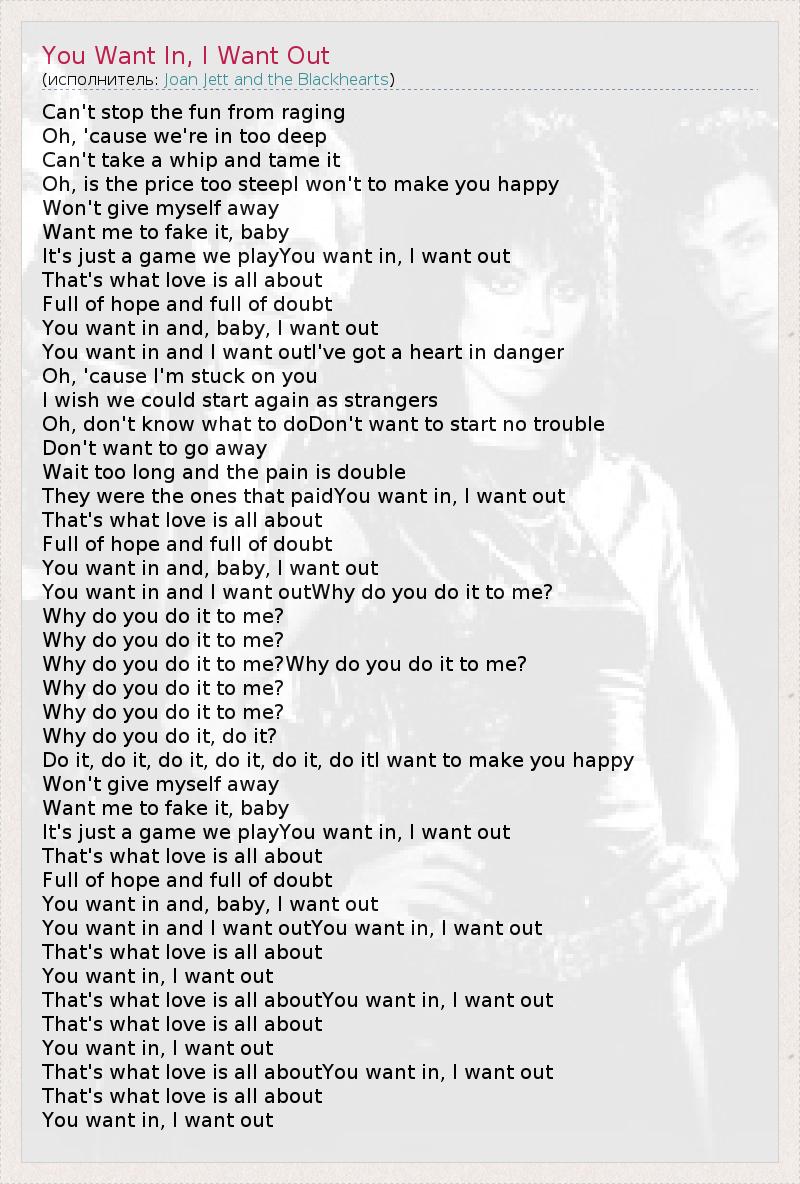 Can't stop the fun from raging Oh, 'cause we're in too deep Can't take a whip and tame it Oh, is the price too steepI won't to make you happy Won't give myself away Want me to fake it, baby It's just a game we playYou want in, I want out That's what love is all about Full of hope and full of doubt You want in and, baby, I want out You want in and I want outI've got a heart in danger Oh, 'cause I'm stuck on you I wish we could start again as strangers Oh, don't know what to doDon't want to start no trouble Don't want to go away Wait too long and the pain is double They were the ones that paidYou want in, I want out That's what love is all about Full of hope and full of doubt You want in and, baby, I want out You want in and I want outWhy do you do it to me? Why do you do it to me? Why do you do it to me? Why do you do it to me?Why do you do it to me? Why do you do it to me? Why do you do it to me? Why do you do it, do it? Do it, do it, do it, do it, do it, do itI want to make you happy Won't give myself away Want me to fake it, baby It's just a game we playYou want in, I want out That's what love is all about Full of hope and full of doubt You want in and, baby, I want out You want in and I want outYou want in, I want out That's what love is all about You want in, I want out That's what love is all aboutYou want in, I want out That's what love is all about You want in, I want out That's what love is all aboutYou want in, I want out That's what love is all about You want in, I want out