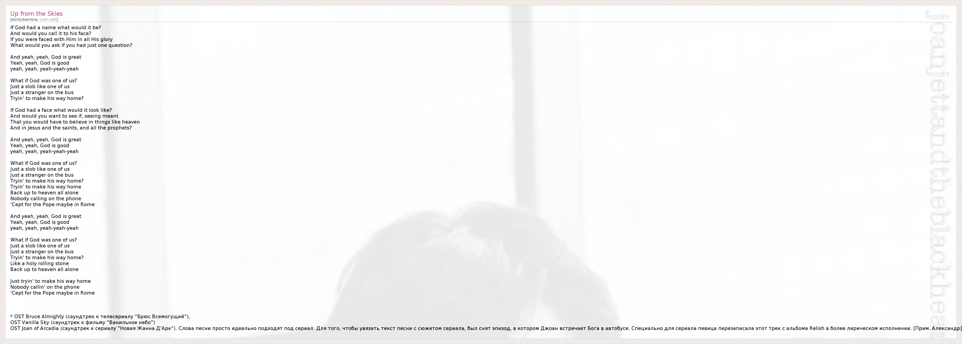 OST Joan of Arcadia (саундтрек к сериалу "Новая Жанна Д'Арк"). Cлова песни просто идеально подходят под сериал. Для того, чтобы увязать текст песни с сюжетом сериала, был снят эпизод, в котором Джоан встречает Бога в автобусе. Специально для сериала певица перезаписала этот трек с альбома Relish в более лирическом исполнении. [Прим. Александр]