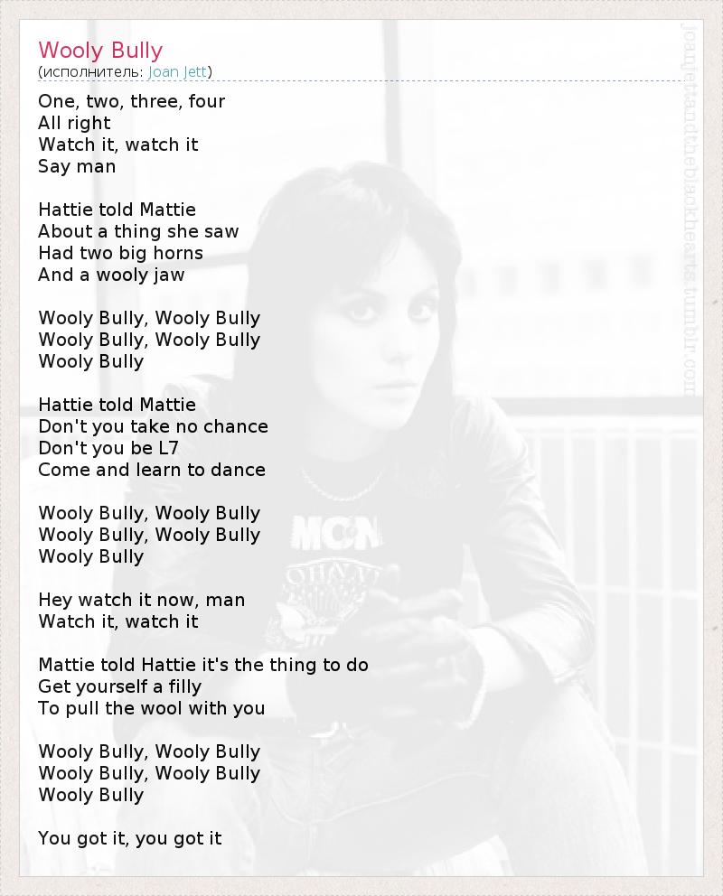 One, two, three, four All right Watch it, watch it Say man Hattie told Mattie About a thing she saw Had two big horns And a wooly jaw Wooly Bully, Wooly Bully Wooly Bully, Wooly Bully Wooly Bully Hattie told Mattie Don't you take no chance Don't you be L7 Come and learn to dance Wooly Bully, Wooly Bully Wooly Bully, Wooly Bully Wooly Bully Hey watch it now, man Watch it, watch it Mattie told Hattie it's the thing to do Get yourself a filly To pull the wool with you Wooly Bully, Wooly Bully Wooly Bully, Wooly Bully Wooly Bully You got it, you got it