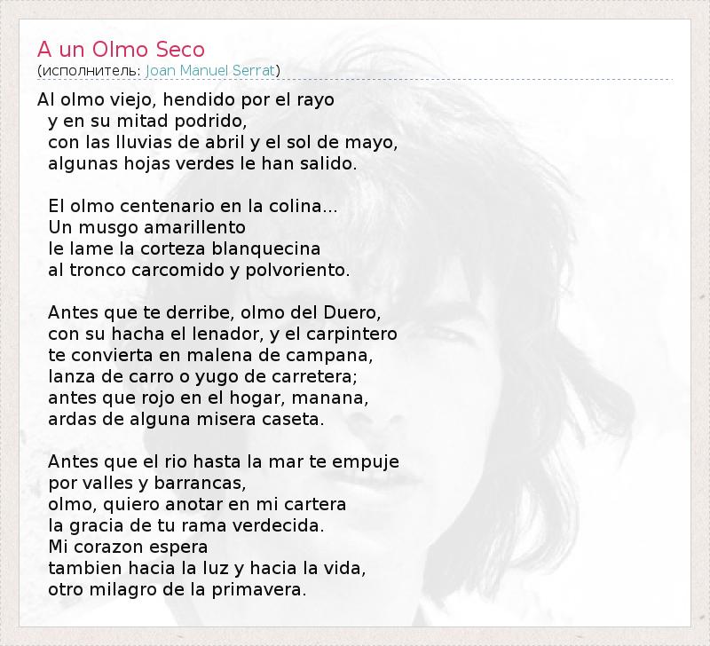 Al olmo viejo, hendido por el rayo y en su mitad podrido, con las lluvias de abril y el sol de mayo, algunas hojas verdes le han salido. El olmo centenario en la colina... Un musgo amarillento le lame la corteza blanquecina al tronco carcomido y polvoriento. Antes que te derribe, olmo del Duero, con su hacha el lenador, y el carpintero te convierta en malena de campana, lanza de carro o yugo de carretera; antes que rojo en el hogar, manana, ardas de alguna misera caseta. Antes que el rio hasta la mar te empuje por valles y barrancas, olmo, quiero anotar en mi cartera la gracia de tu rama verdecida. Mi corazon espera tambien hacia la luz y hacia la vida, otro milagro de la primavera.