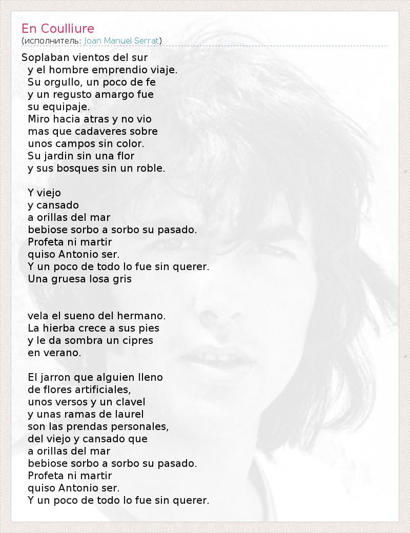 Soplaban vientos del sur y el hombre emprendio viaje. Su orgullo, un poco de fe y un regusto amargo fue su equipaje. Miro hacia atras y no vio mas que cadaveres sobre unos campos sin color. Su jardin sin una flor y sus bosques sin un roble. Y viejo y cansado a orillas del mar bebiose sorbo a sorbo su pasado. Profeta ni martir quiso Antonio ser. Y un poco de todo lo fue sin querer. Una gruesa losa gris vela el sueno del hermano. La hierba crece a sus pies y le da sombra un cipres en verano. El jarron que alguien lleno de flores artificiales, unos versos y un clavel y unas ramas de laurel son las prendas personales, del viejo y cansado que a orillas del mar bebiose sorbo a sorbo su pasado. Profeta ni martir quiso Antonio ser. Y un poco de todo lo fue sin querer.