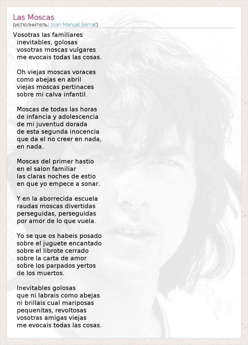 Vosotras las familiares inevitables, golosas vosotras moscas vulgares me evocais todas las cosas. Oh viejas moscas voraces como abejas en abril viejas moscas pertinaces sobre mi calva infantil. Moscas de todas las horas de infancia y adolescencia de mi juventud dorada de esta segunda inocencia que da el no creer en nada, en nada. Moscas del primer hastio en el salon familiar las claras noches de estio en que yo empece a sonar. Y en la aborrecida escuela raudas moscas divertidas perseguidas, perseguidas por amor de lo que vuela. Yo se que os habeis posado sobre el juguete encantado sobre el librote cerrado sobre la carta de amor sobre los parpados yertos de los muertos. Inevitables golosas que ni labrais como abejas ni brillais cual mariposas pequenitas, revoltosas vosotras amigas viejas me evocais todas las cosas.