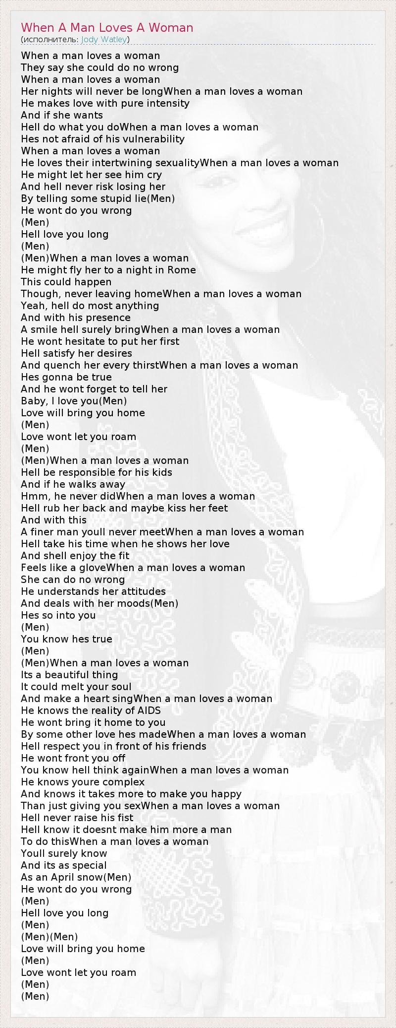 When a man loves a woman They say she could do no wrong When a man loves a woman Her nights will never be longWhen a man loves a woman He makes love with pure intensity And if she wants Hell do what you doWhen a man loves a woman Hes not afraid of his vulnerability When a man loves a woman He loves their intertwining sexualityWhen a man loves a woman He might let her see him cry And hell never risk losing her By telling some stupid lie(Men) He wont do you wrong (Men) Hell love you long (Men) (Men)When a man loves a woman He might fly her to a night in Rome This could happen Though, never leaving homeWhen a man loves a woman Yeah, hell do most anything And with his presence A smile hell surely bringWhen a man loves a woman He wont hesitate to put her first Hell satisfy her desires And quench her every thirstWhen a man loves a woman Hes gonna be true And he wont forget to tell her Baby, I love you(Men) Love will bring you home (Men) Love wont let you roam (Men) (Men)When a man loves a woman Hell be responsible for his kids And if he walks away Hmm, he never didWhen a man loves a woman Hell rub her back and maybe kiss her feet And with this A finer man youll never meetWhen a man loves a woman Hell take his time when he shows her love And shell enjoy the fit Feels like a gloveWhen a man loves a woman She can do no wrong He understands her attitudes And deals with her moods(Men) Hes so into you (Men) You know hes true (Men) (Men)When a man loves a woman Its a beautiful thing It could melt your soul And make a heart singWhen a man loves a woman He knows the reality of AIDS He wont bring it home to you By some other love hes madeWhen a man loves a woman Hell respect you in front of his friends He wont front you off You know hell think againWhen a man loves a woman He knows youre complex And knows it takes more to make you happy Than just giving you sexWhen a man loves a woman Hell never raise his fist Hell know it doesnt make him more a man To do thisWhen a man loves a woman Youll surely know And its as special As an April snow(Men) He wont do you wrong (Men) Hell love you long (Men) (Men)(Men) Love will bring you home (Men) Love wont let you roam (Men) (Men)