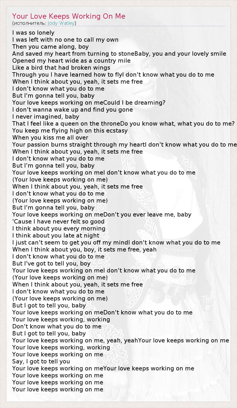 I was so lonely I was left with no one to call my own Then you came along, boy And saved my heart from turning to stoneBaby, you and your lovely smile Opened my heart wide as a country mile Like a bird that had broken wings Through you I have learned how to flyI don't know what you do to me When I think about you, yeah, it sets me free I don't know what you do to me But I'm gonna tell you, baby Your love keeps working on meCould I be dreaming? I don't wanna wake up and find you gone I never imagined, baby That I feel like a queen on the throneDo you know what, what you do to me? You keep me flying high on this ecstasy When you kiss me all over Your passion burns straight through my heartI don't know what you do to me When I think about you, yeah, it sets me free I don't know what you do to me But I'm gonna tell you, baby Your love keeps working on meI don't know what you do to me (Your love keeps working on me) When I think about you, yeah, it sets me free I don't know what you do to me (Your love keeps working on me) But I'm gonna tell you, baby Your love keeps working on meDon't you ever leave me, baby 'Cause I have never felt so good I think about you every morning I think about you late at night I just can't seem to get you off my mindI don't know what you do to me When I think about you, boy, it sets me free, yeah I don't know what you do to me But I've got to tell you, boy Your love keeps working on meI don't know what you do to me (Your love keeps working on me) When I think about you, yeah, it sets me free I don't know what you do to me (Your love keeps working on me) But I got to tell you, baby Your love keeps working on meDon't know what you do to me Your love keeps working, working Don't know what you do to me But I got to tell you, baby Your love keeps working on me, yeah, yeahYour love keeps working on me Your love keeps working, working Your love keeps working on me Say, I got to tell you Your love keeps working on meYour love keeps working on me Your love keeps working on me Your love keeps working on me Your love keeps working on me