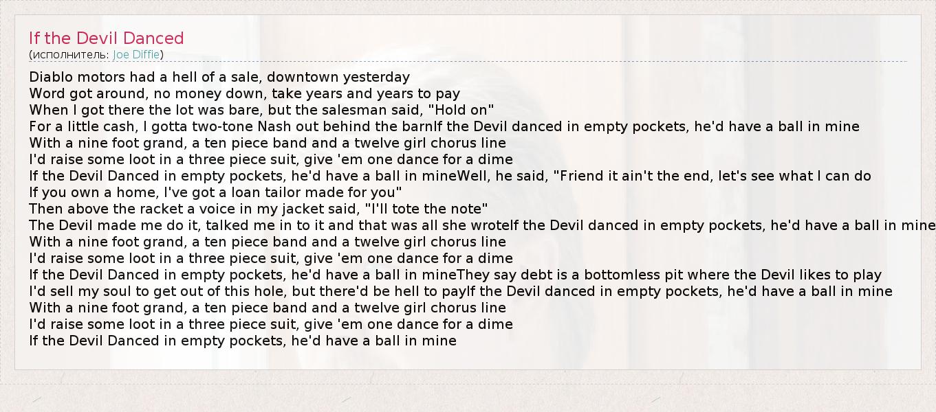 Diablo motors had a hell of a sale, downtown yesterday Word got around, no money down, take years and years to pay When I got there the lot was bare, but the salesman said, "Hold on" For a little cash, I gotta two-tone Nash out behind the barnIf the Devil danced in empty pockets, he'd have a ball in mine With a nine foot grand, a ten piece band and a twelve girl chorus line I'd raise some loot in a three piece suit, give 'em one dance for a dime If the Devil Danced in empty pockets, he'd have a ball in mineWell, he said, "Friend it ain't the end, let's see what I can do If you own a home, I've got a loan tailor made for you" Then above the racket a voice in my jacket said, "I'll tote the note" The Devil made me do it, talked me in to it and that was all she wroteIf the Devil danced in empty pockets, he'd have a ball in mine With a nine foot grand, a ten piece band and a twelve girl chorus line I'd raise some loot in a three piece suit, give 'em one dance for a dime If the Devil Danced in empty pockets, he'd have a ball in mineThey say debt is a bottomless pit where the Devil likes to play I'd sell my soul to get out of this hole, but there'd be hell to payIf the Devil danced in empty pockets, he'd have a ball in mine With a nine foot grand, a ten piece band and a twelve girl chorus line I'd raise some loot in a three piece suit, give 'em one dance for a dime If the Devil Danced in empty pockets, he'd have a ball in mine