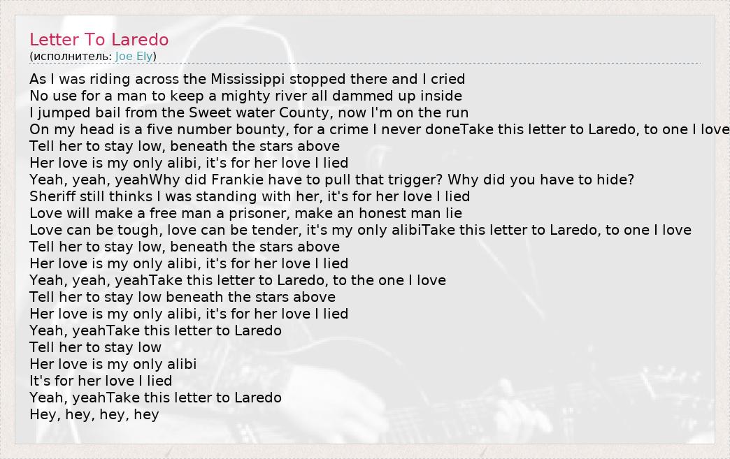 А как ты думаешь, о чем песня "Letter To Laredo" ?