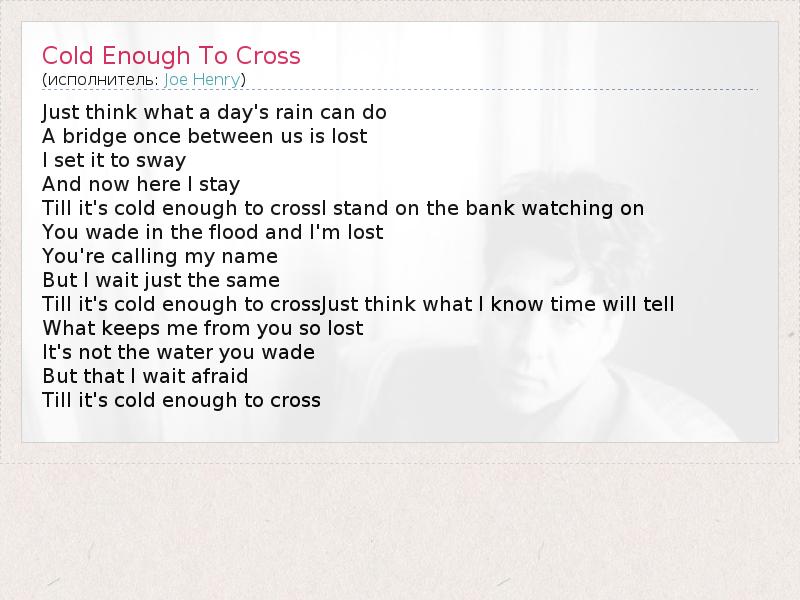 Just think what a day's rain can do A bridge once between us is lost I set it to sway And now here I stay Till it's cold enough to crossI stand on the bank watching on You wade in the flood and I'm lost You're calling my name But I wait just the same Till it's cold enough to crossJust think what I know time will tell What keeps me from you so lost It's not the water you wade But that I wait afraid Till it's cold enough to cross